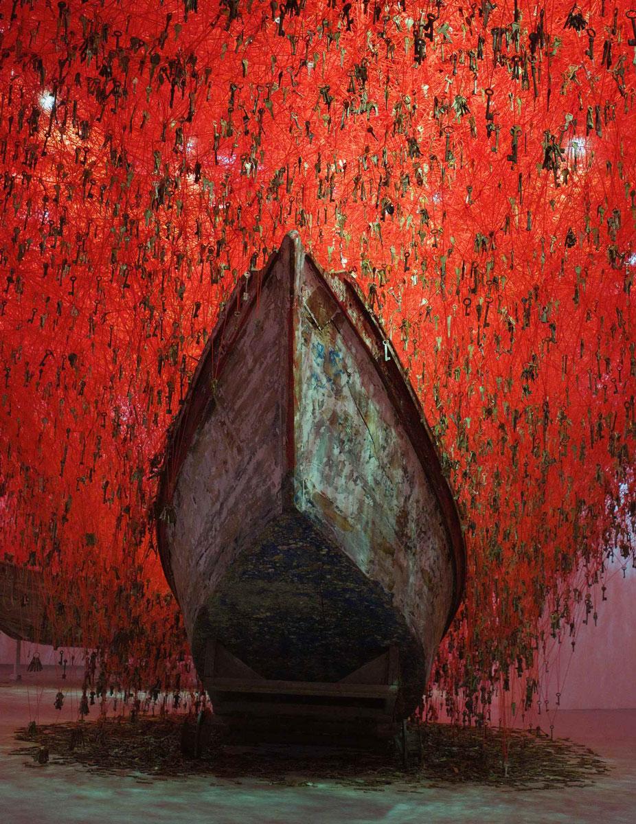 Shiota revisits the boat theme in Destination, where a fleet of eleven-foot boats surround a sixteen-foot vessel, the ensemble caught in a red sea of red yarn. “I have been using boats [in my artwork] since my exhibition at the Japan Pavilion at the Venice Biennale in 2015,” explained Shiota, who, like many artists, uses boats as symbols of travel and finding one’s destination, though there is a slightly dark element to all this. If viewing the boats from below, as in the Bon Marché exhibit, the viewer becomes a drowning victim looking up at the hulls. Here, red yarn ensnares the boats, possibly preventing these vessels from arriving at their final destination. None of Shiota’s boats carry passengers but perhaps, as the artist suggests, they carry spirits and memories of the dead.