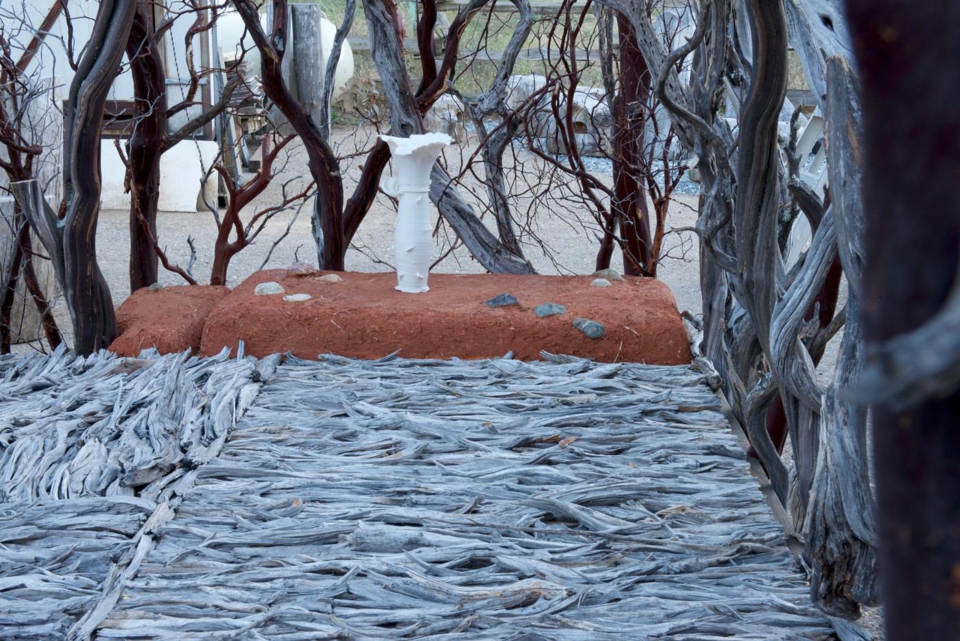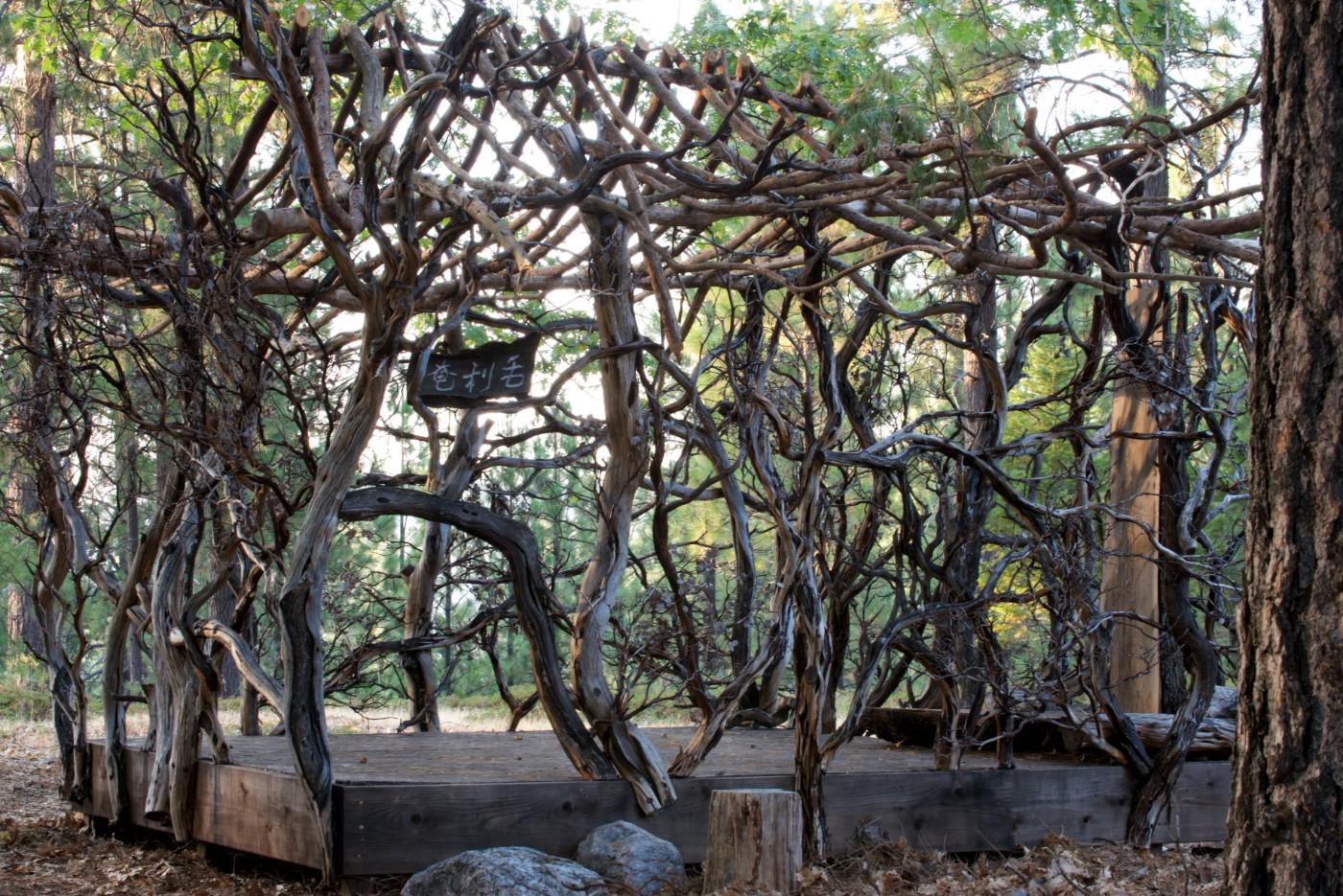 The LACMA installation centers around a teahouse-style construction similar to an installation Mizuno created on the ranch. Inspired by the traditional Japanese tea ceremony, Mizuno’s tea house looks almost as if it has grown out of the forest. His otherworldly installation combines the traditional teahouse shape and sense of ritual communion with the wild beauty and magic of the forest, incorporating tree trunks, manzanita shrubs, ceramic pieces and Japanese calligraphy. He created a space that simultaneously gives homage to the forest and creates a place for shared experience. As Mizuno says on his website, “I wanted to create a space that was conceptual in character but could be functionally used for the purposes of having and experiencing tea. When confined to the interior space, I felt it was important to feel as though you were in another dimension. A space isolated from reality where people could gather for the singular purpose of enjoying each other's company.”