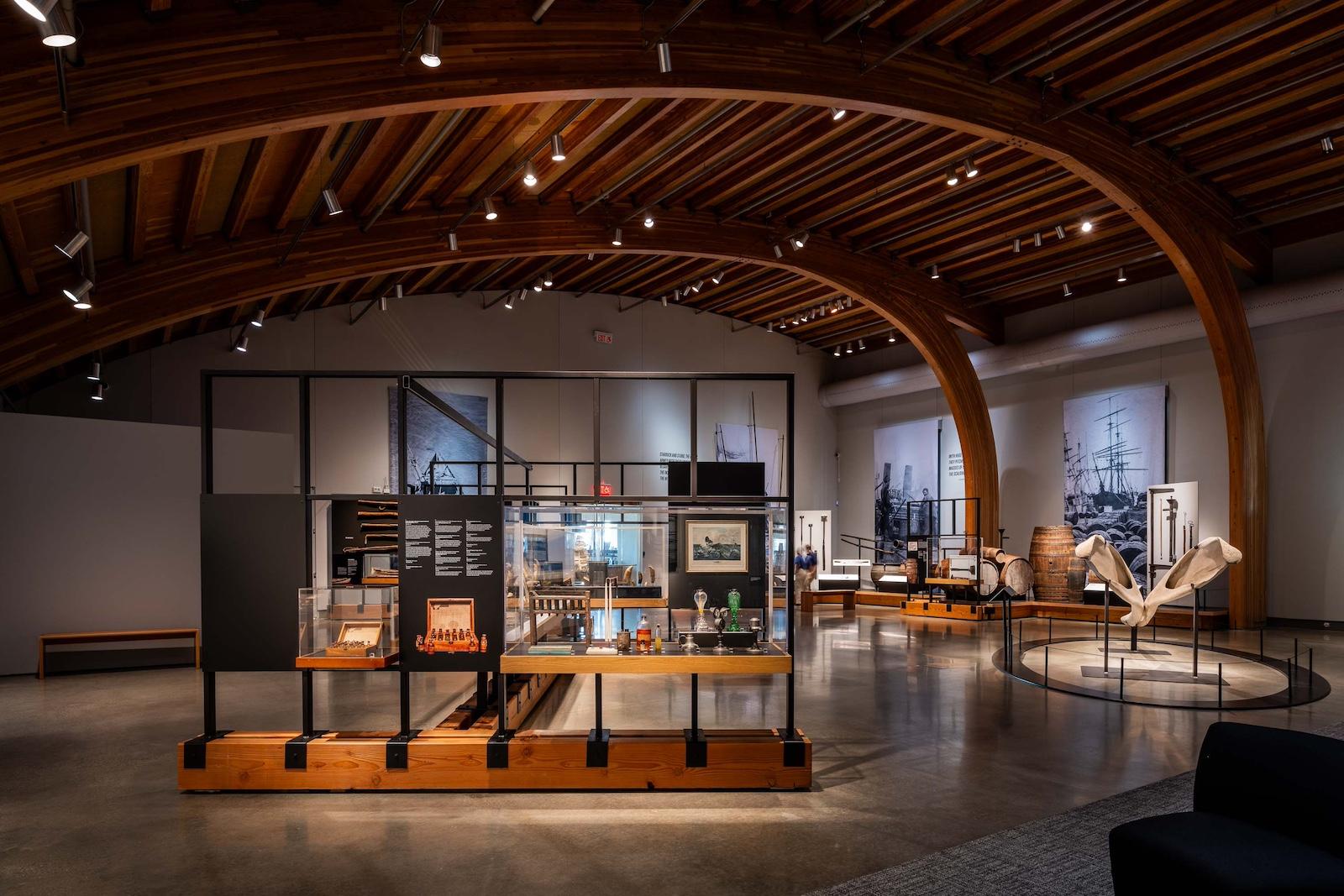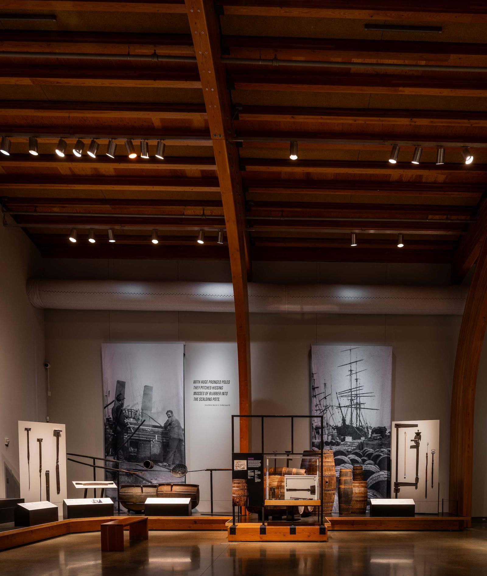 The museum has done an excellent job in curating a selection of objects from their permanent collection that accompany Sances’ work. Entering the space, visitors will discover many items that help to weave together a story of the triumphs and challenges of whale hunting. A large blubber hook sits on a raised platform, massive. Its presence sheds light on the gigantic scale that the whales embody. Nearby, an enlarged black and white photograph functions as an illustration, showing two men on a platform that extends off the side of a ship.