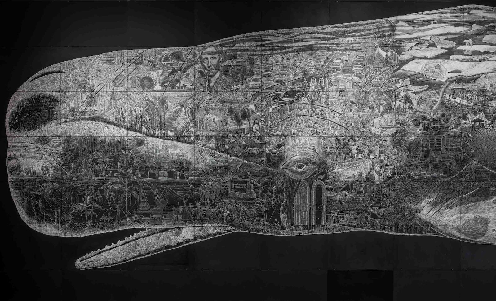 Artist Jos Sances was inspired by Herman Melville’s story of Moby Dick and used the elaborate silhouette of a life-size, female sperm whale, which now spans nearly the entirety of the museum’s back wall. Sances is an intricate draftsman, and his line work on the scratchboards paints a story of American history– the good, the bad, and the ugly. It’s all there.