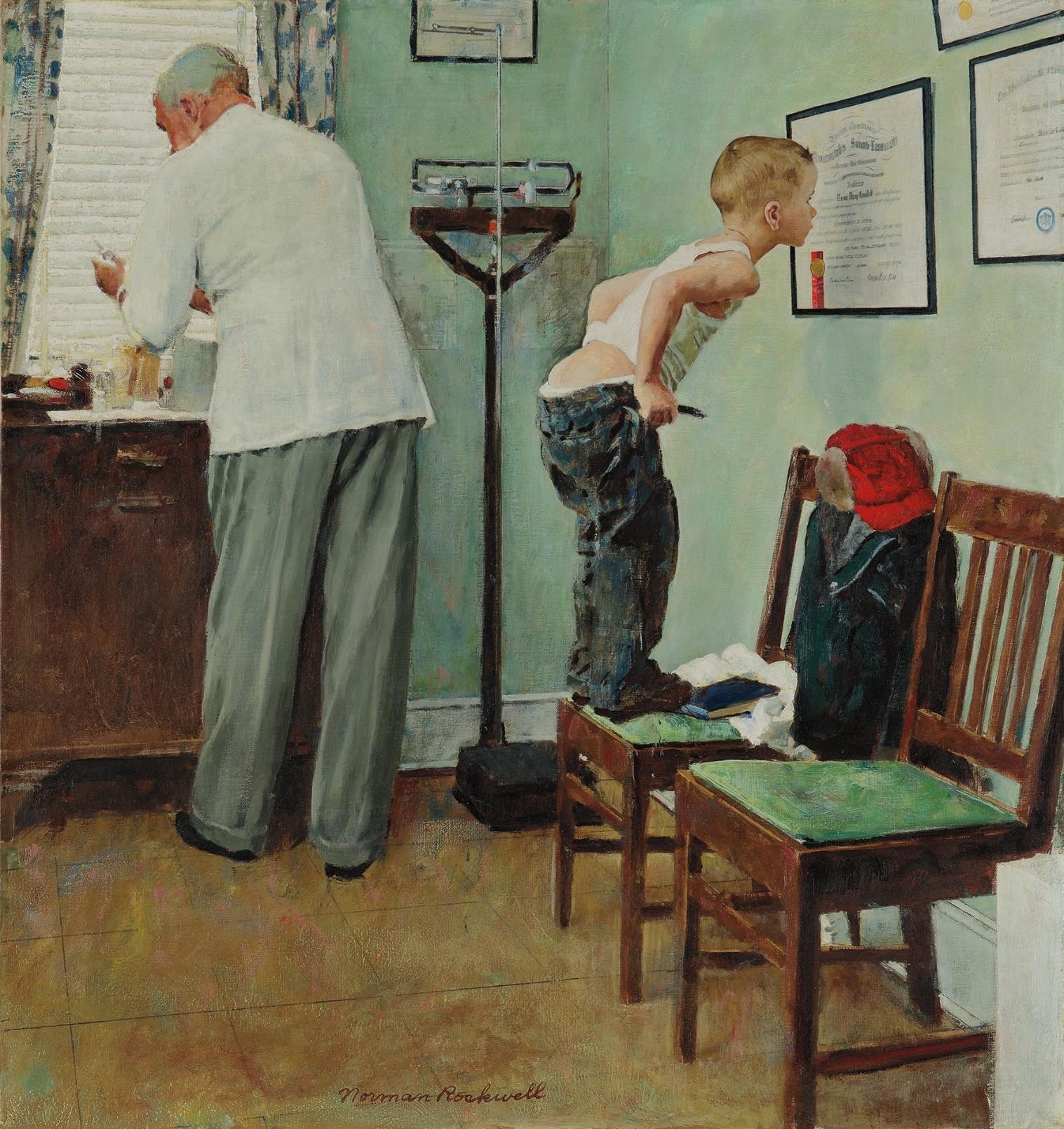 Before the Shot is an excellent example of Rockwell’s ability to distill the feelings encapsulated in a moment of time. A young boy crouches apprehensively in his doctor’s office, baring his bottom to receive a shot. This painting skillfully expresses the anxiety and inadvertent humor of the situation. The universal appeal of his work was also increased by his use of neighbors and townsfolk as models, as he did for Before the Shot. The real-life feel of the models makes this iconic image even more authentic. Rockwell’s relatable, incredibly popular imagery has had an indelible impact on pop culture and the American psyche.