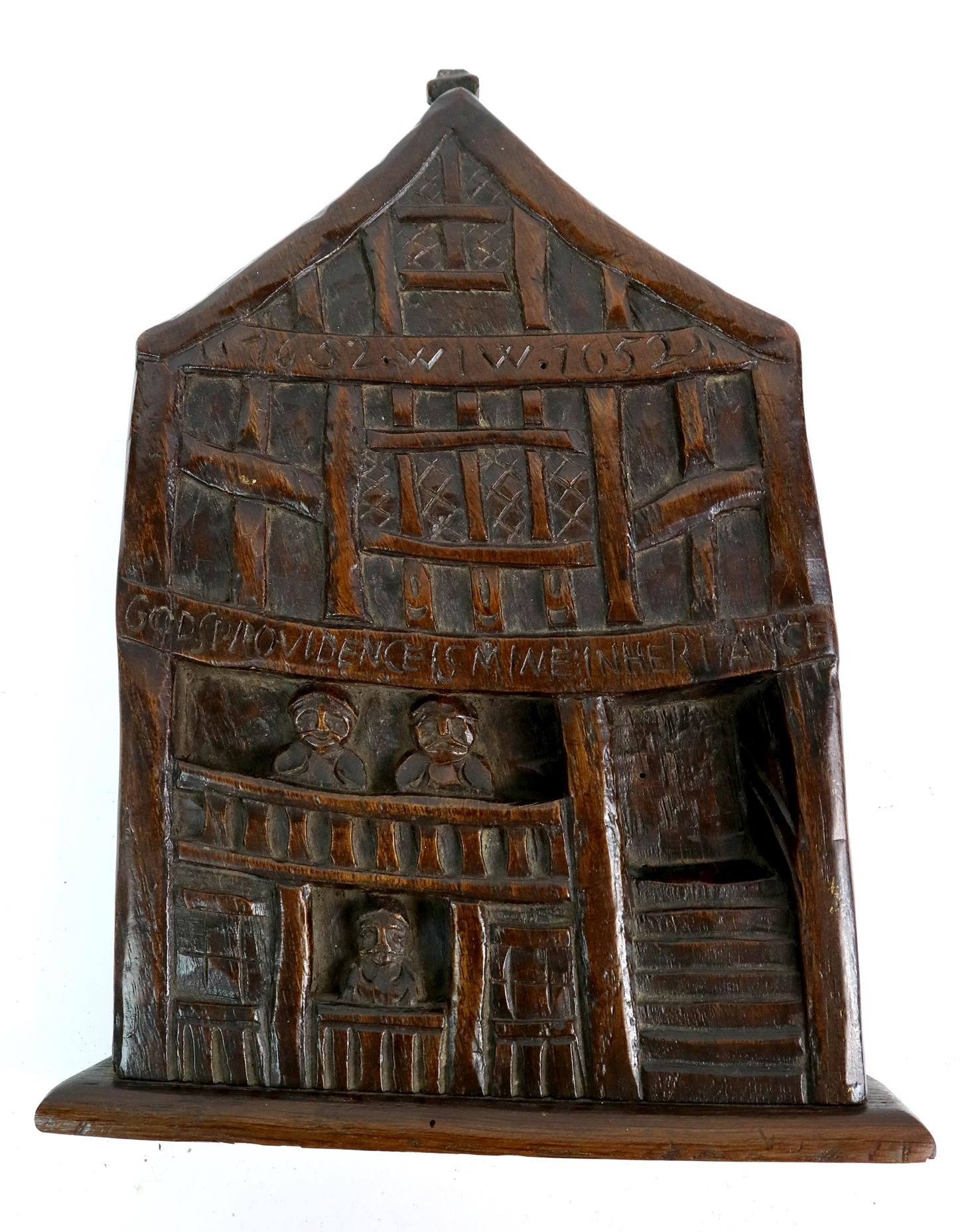 Mementos were also made, such as this seventeenth-century carved oak panel depicting the façade of what has become known as God’s Providence House, which is headed to auction in Shrewsbury later this week. In appearance, the approximately 10” x 6 ½” plaque borders on folk art with its primitively chiseled figures. It is estimated to sell for £800-1,200 ($1,000-1,500).