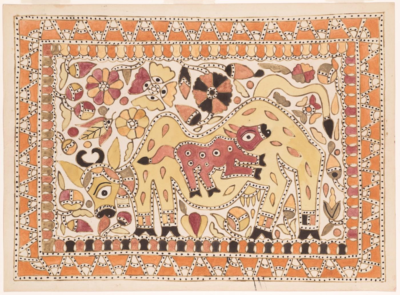 Mithila, a geographical and cultural region in the state of Bihar in north-eastern India, has recently attracted attention for its pictorial art. Mithila painting, or Madhubani art, has been created for centuries using fingers, sticks, and brushes with natural dyes and pigments. The subjects depicted range from deities to common women, from family celebrations, such as weddings, to contemporary events. The result is a series of intricate and hypnotizing compositions in which the background is filled with geometrical patterns as well as natural, symbolic elements.