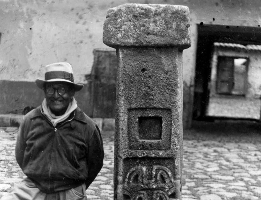 Detail of Peruvian archaeologist Julian C. Tello photographed standing next to the Tello Obelisk, named for his discovery.