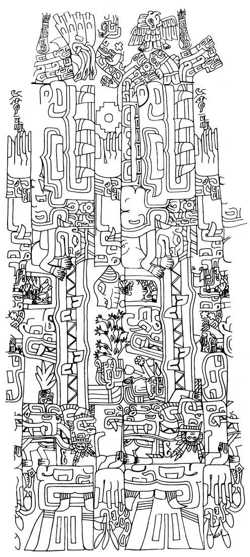 The Tello Obelisk, found at Chavín de Huántar, exemplifies these motifs. Contained within the intricate carving are the fanged jaws of a caiman here, the splayed wings of a bird of prey there—and each element considered separately leads into a dizzying array of embellishments that become another image. It is believed to depict an important deity to the Chavín, and is carved from white granite, a tough igneous rock (notoriously difficult to carve) able to weather the elements and the years with little destruction.