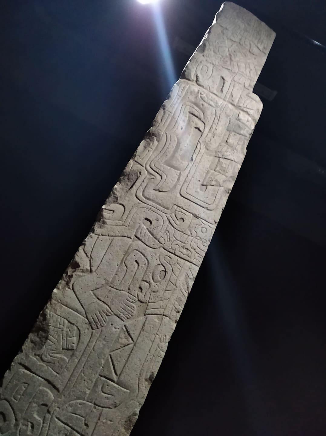 Photo of a stela carved in the style of the Chavín at the site of Kuntur Wasi in the Jequetepeque Valley of Peru.