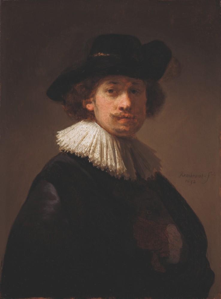 Self-portrait, wearing a ruff and black hat shows a young Rembrandt in fine clothes gazing out at the viewer. Characteristically self-possessed, the intimacy of the painting shows how the artist unflinchingly examined himself in his works. This is one of his earliest self-portraits, and even here, a mature honesty and curiosity is on view.