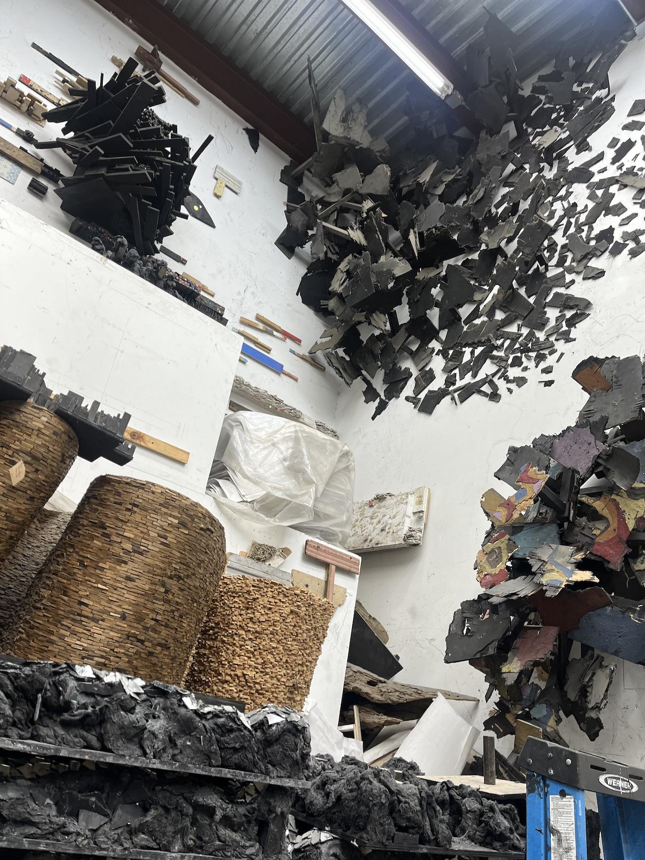 And then there are books, including Journal: Leonardo Drew, a generous publication covering much of his career, put out by the Contemporary Art Museum in Raleigh, NC. The book lists every material Drew used in the depicted works, with processes and ideas scrawled in pencil and photographed. “You could almost make your own Leonardo based on that book,” he says.