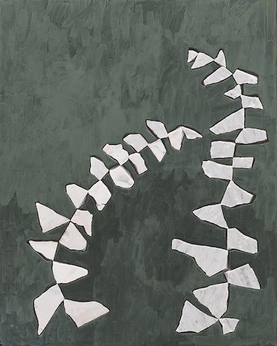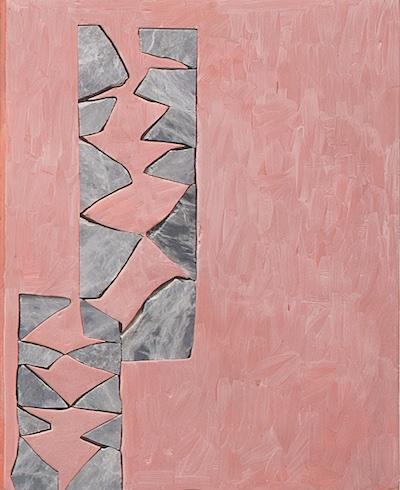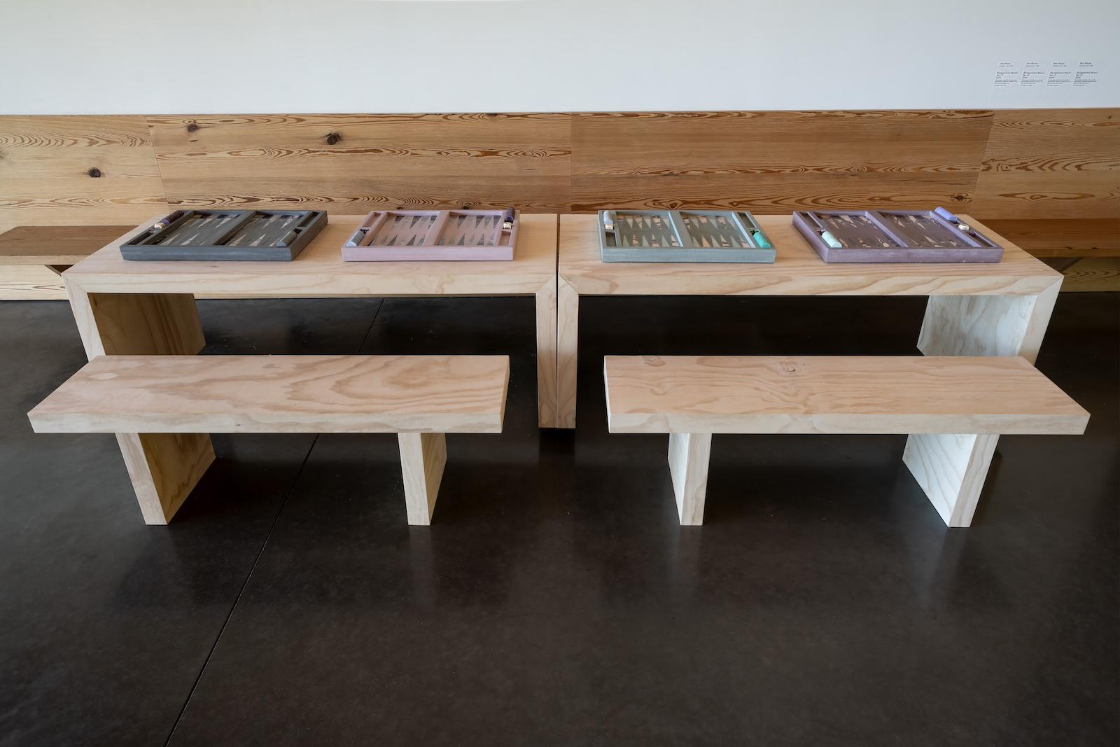 “I want everything,” she says of her work and its ingredients, and that includes the dynamic art of her husband, Eddie Martinez—whose paintings are situated in the galleries on the opposite side of the museum from Moyer’s—and games, such as the hand-carved backgammon boards made of tinted concrete with marble inlay set out on artist-made wood tables and benches in the museum’s lobby. There’s a lot to think about here.