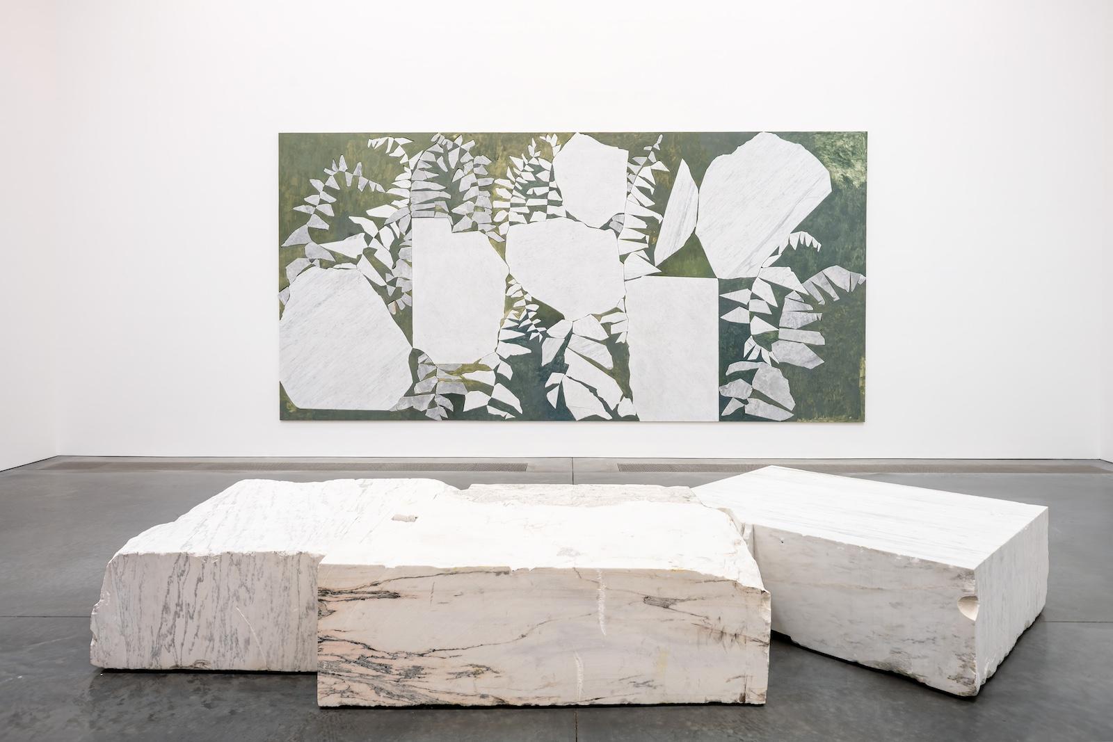 Crafting and installing this striking, powerful, and mystifying creation has enabled artist Sam Moyer to turn the museum into an extension of her home studio, keeping a wide array of materials and procedures in play. Her show, which opened on June 30 and runs through September 29, is titled “Sam Moyer: Ferns Teeth” and addresses nature at its most lyrical, anxiety-producing, and assertive.