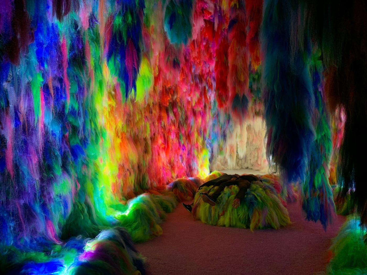 One can’t simply ignore to what extent mainstream experiential installation influenced the artworld, though, and the Icelandic pavilion, located in the quieter island of Giudecca, hosts “Chromo Sapiens,” which consists of three chamber-like environments that artist Hrafnhildur Arnardóttir artfully decked in synthetic fur. Its color palette comprises darker hues, rainbow colors and pastel tones, and it makes the viewer feel like they’re inside a fantastic creature or in the depths of a tropical rainforest, and the result is, simply put, trippy, and we wouldn’t be surprised to see Arnardóttir’s work being hosted in Meow Wolf’s House of Eternal Return.
