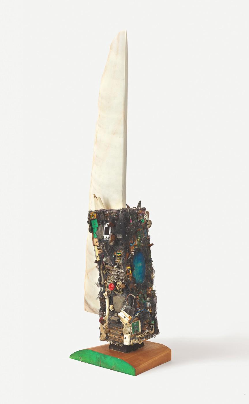 Whitten was very concerned with our environmental, technological and political future, and crafted his work to both honor the past and imagine a hopeful future. His sculptures are a potent combination of African and European art and artifacts. Created over the past five decades during his summers on Crete, they merge Grecian and African mythology with ritualistic tribal objects, European sculpture and modernist sensibility. His wooden forms adorned with cell phone parts, chip cards, remote controls, and digital detritus, merge past and present. The ritualistic feel of the pieces hints at the transformative power of art. Whitten firmly believed art could open our consciousness to new possibilities, helping us save ourselves from the coming crisis.