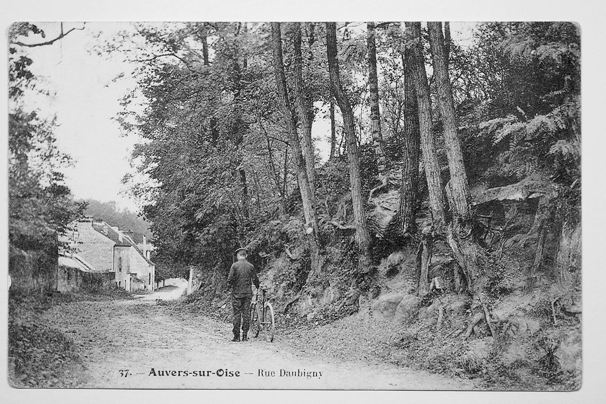 But the intimate scope of the painting didn’t stop Wouter van der Veen, the scientific director of the Institut Van Gogh, from recognizing it in a vintage postcard dating from 1900 to 1910. The scenic photo shows a man walking a bike on the rue Daubigny in Auvers-sur-Oise, near Auberge Ravoux, the inn where Van Gogh stayed for several months before his death.
