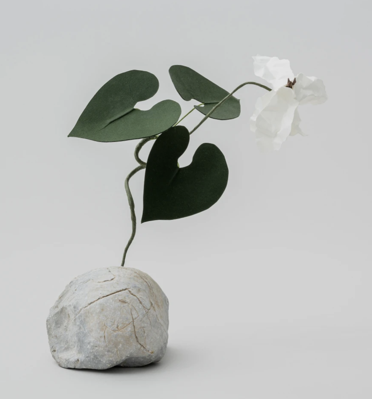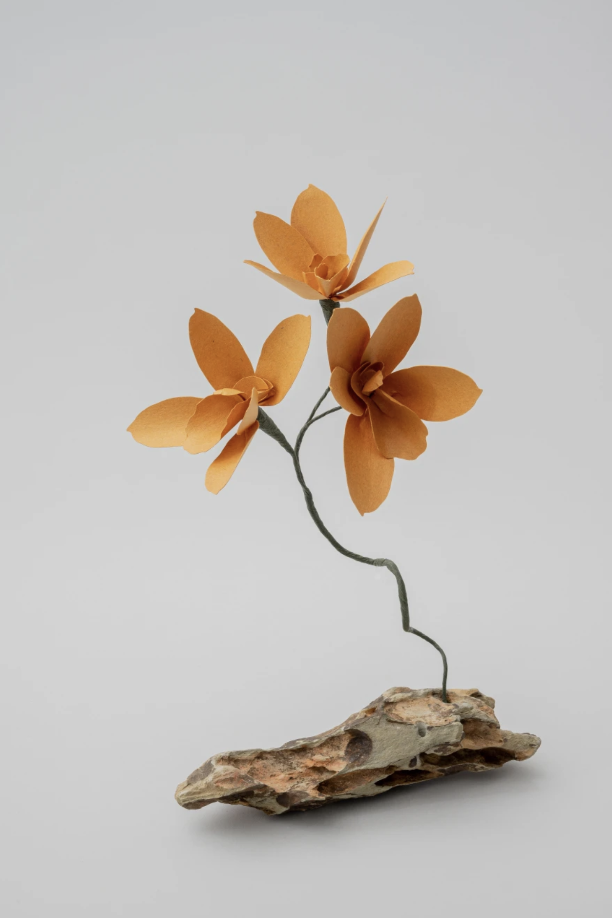 Shinozaki also practices a back-to-the-earth aesthetic in the exhibition Paper Eden, but her work is all about simulating the sublime. Trained in the artistry of flower arrangement, she creates classic ikebana floral arrangements with cut-paper and wire and sets them in rough, natural stones. Titled for the types of flowers the sculptures depict, Cyclamen highlights its shapely green leaves over its dainty white petals, while the orange-colored Cymbidium is all flowers and no leaves. Creating a sense of wabi-sabi with found and fabricated means, Shinozaki captures the beauty of nature for all time.