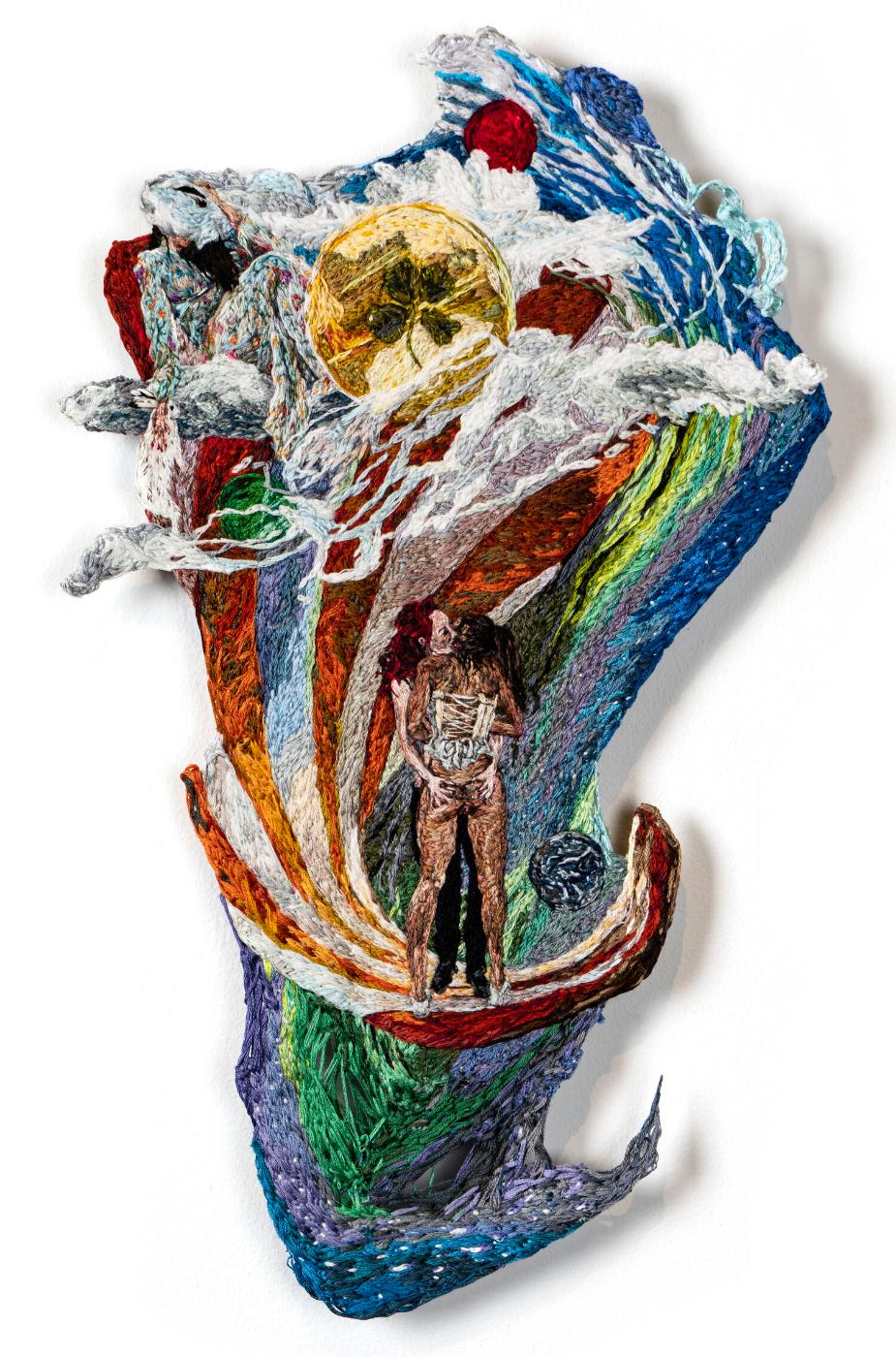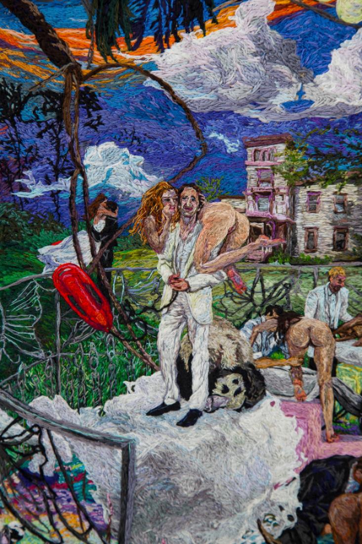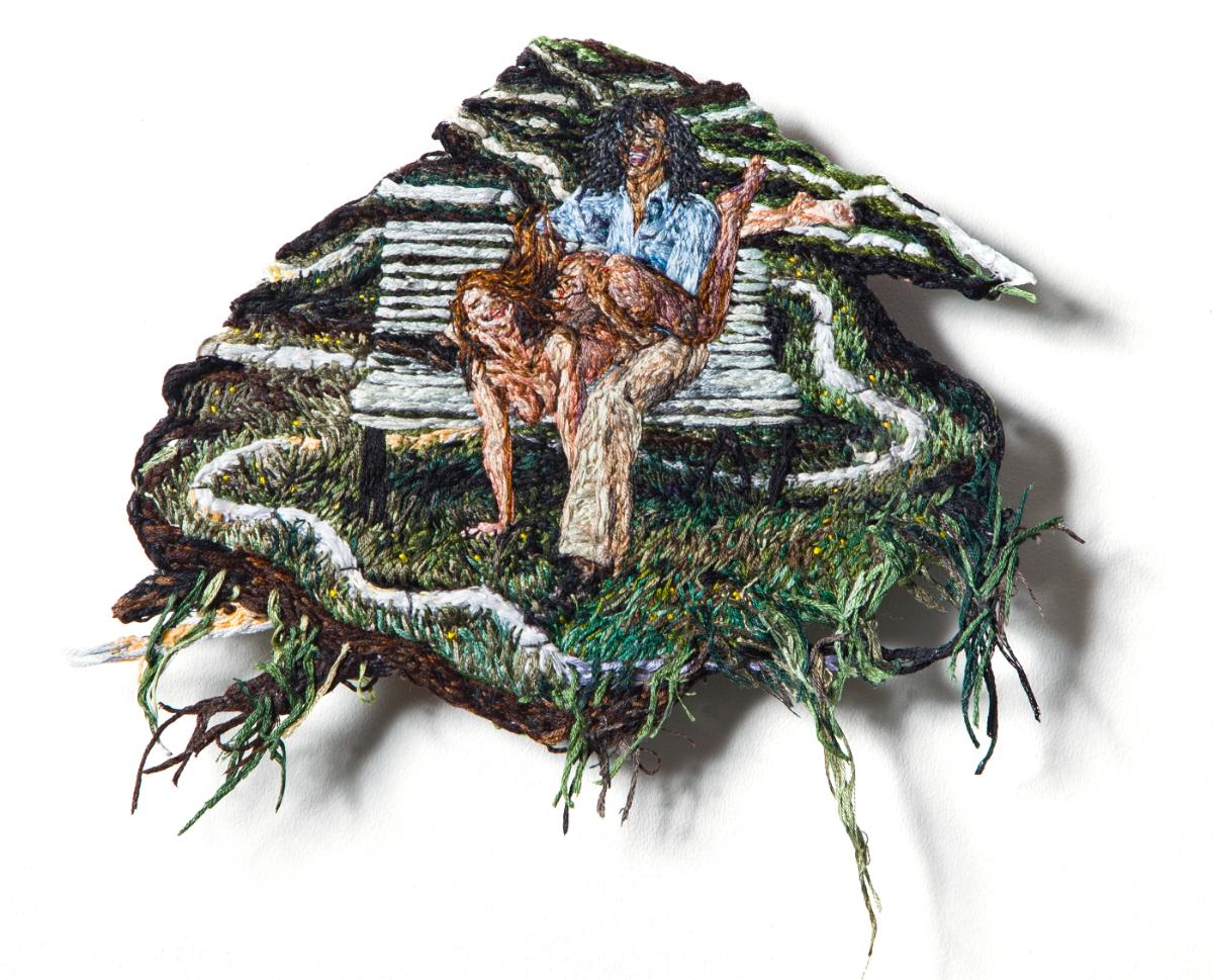 Creating colorful narratives about erotic encounters from needle and thread, Sophia Narrett makes fascinating embroidered artworks that are fueled by love and desire. Trained as a painter, the Brooklyn-based artist began working with yarn by chance while constructing a sculpture during her undergrad studies at Brown University. Further experimenting with thread to stitch some drawings, she brilliantly discovered a way to employ embroidery to simulate figurative paintings. By the time she received her MFA from the Rhode Island School of Design in 2014, she was imaginatively making meaningful art with her new medium, which quickly caught the attention of critics, curators, and collectors.