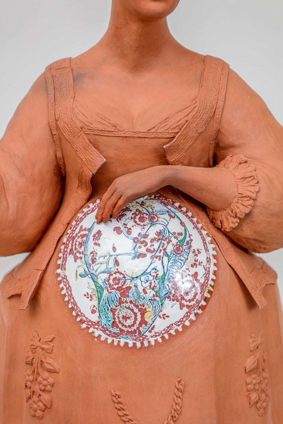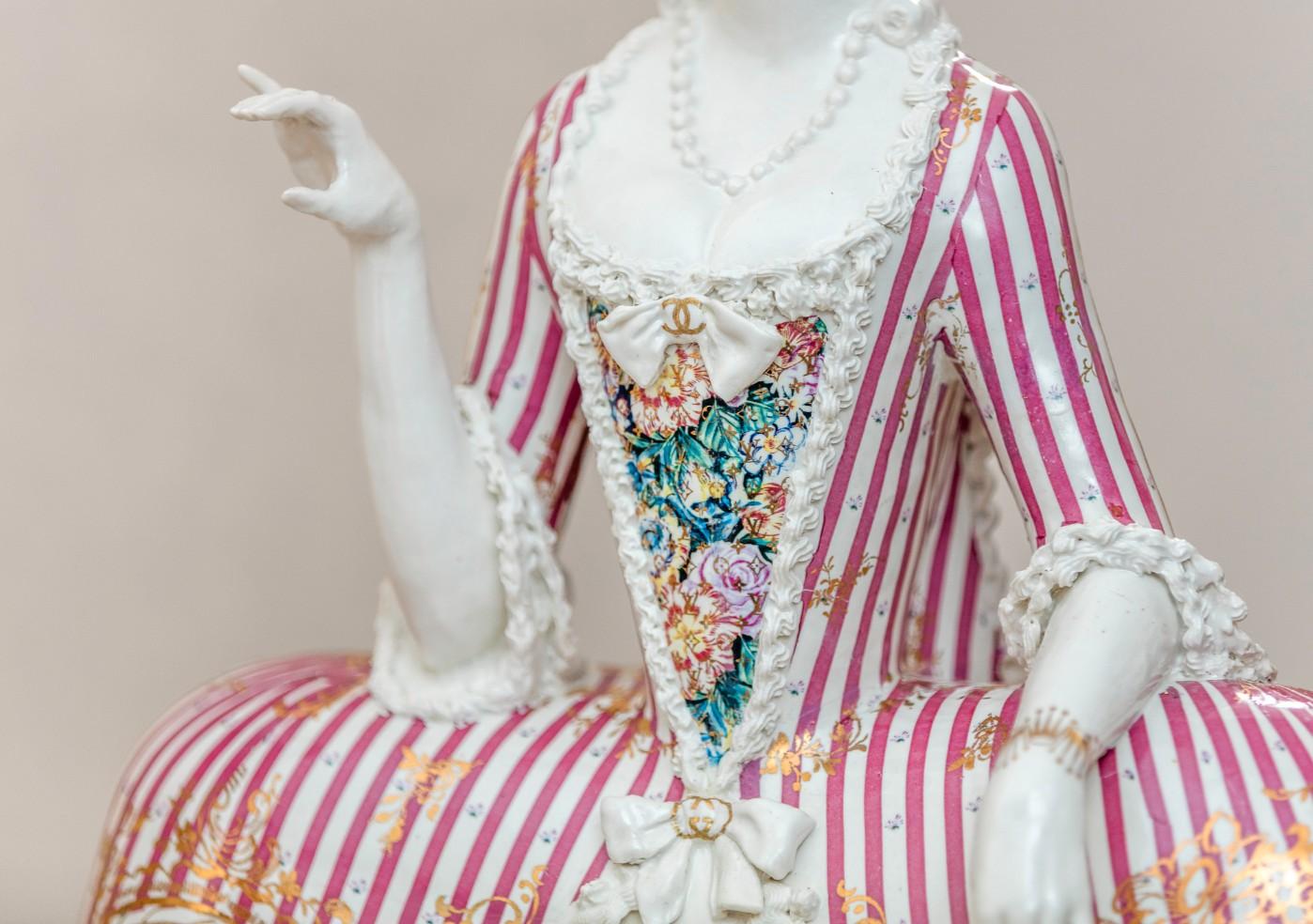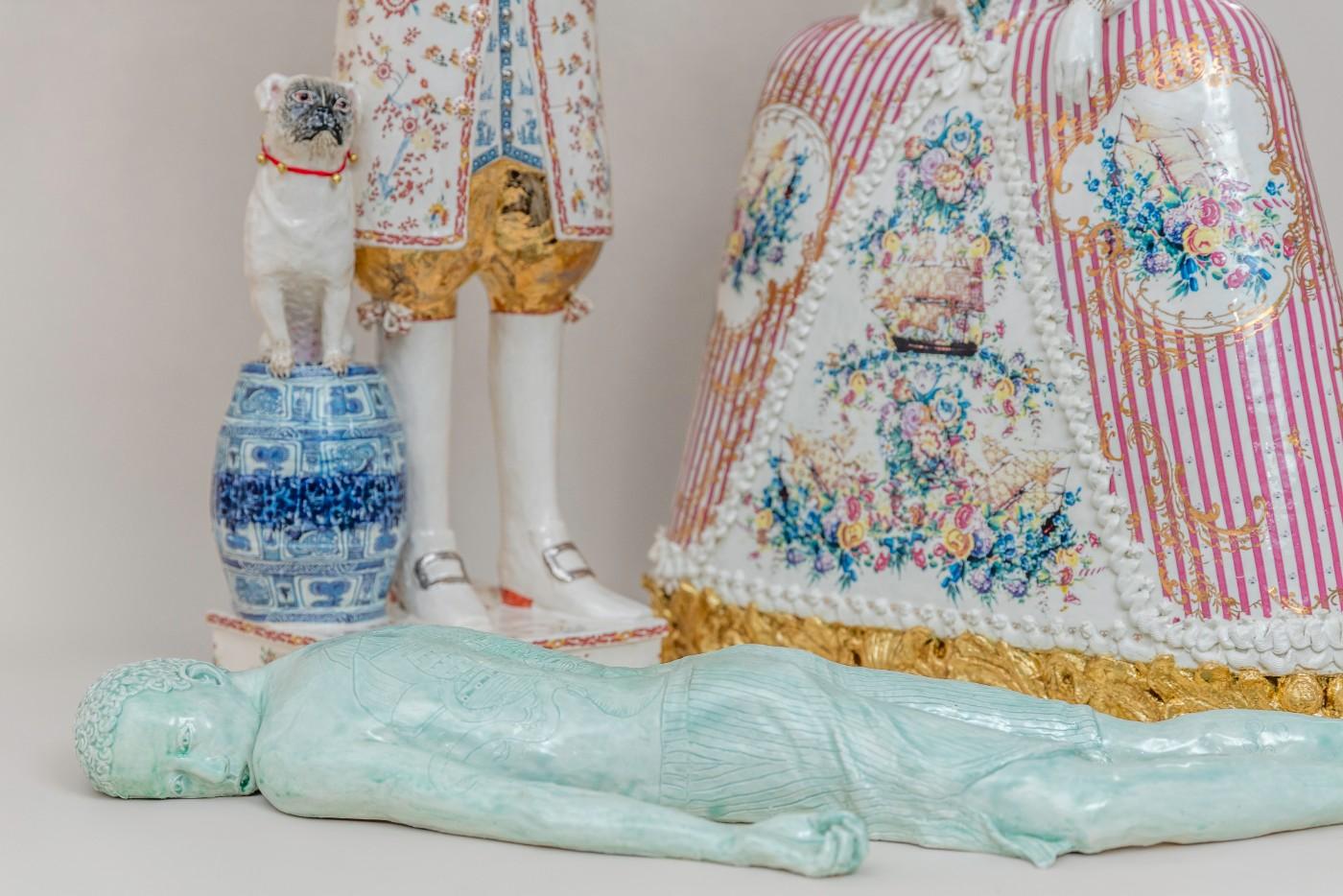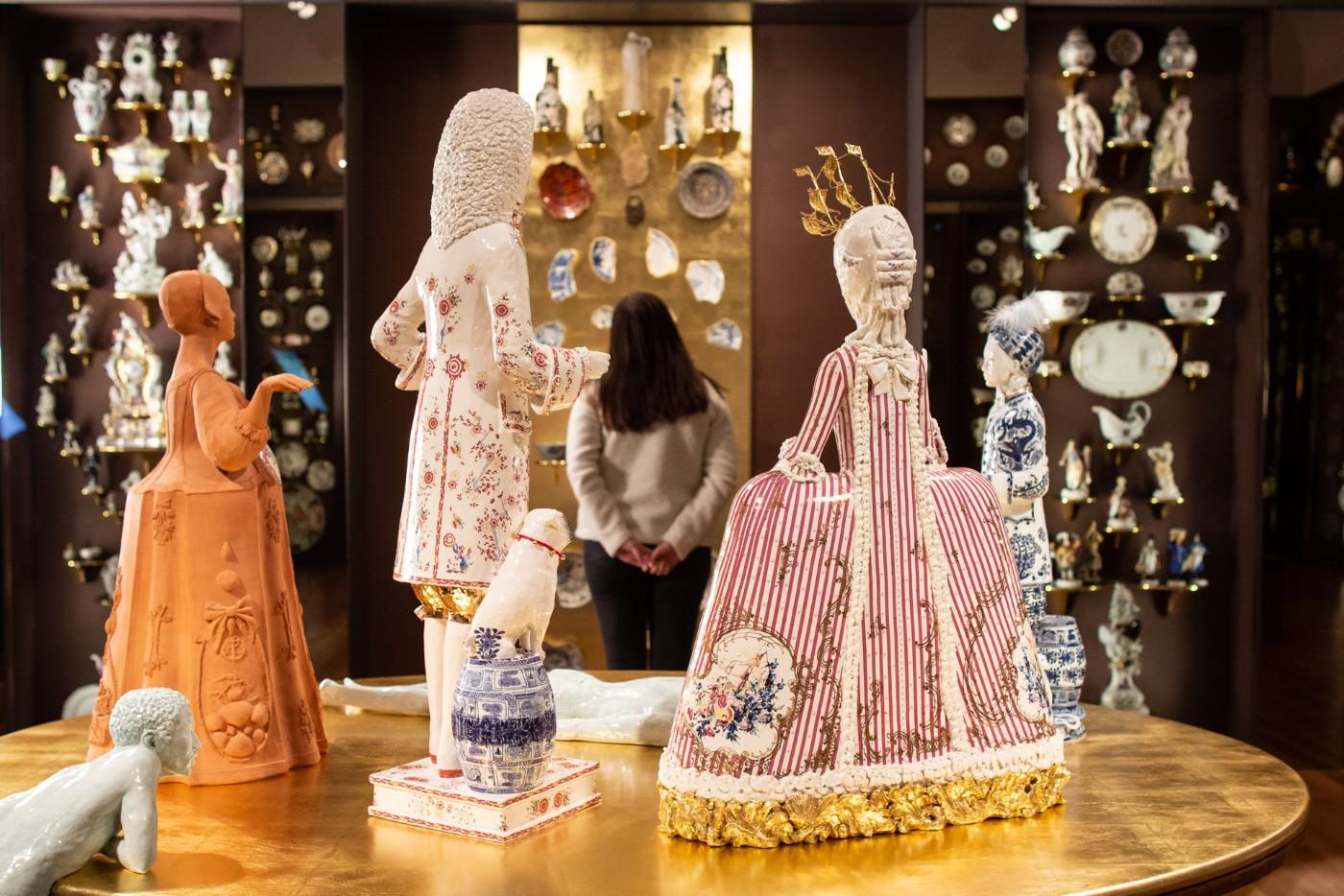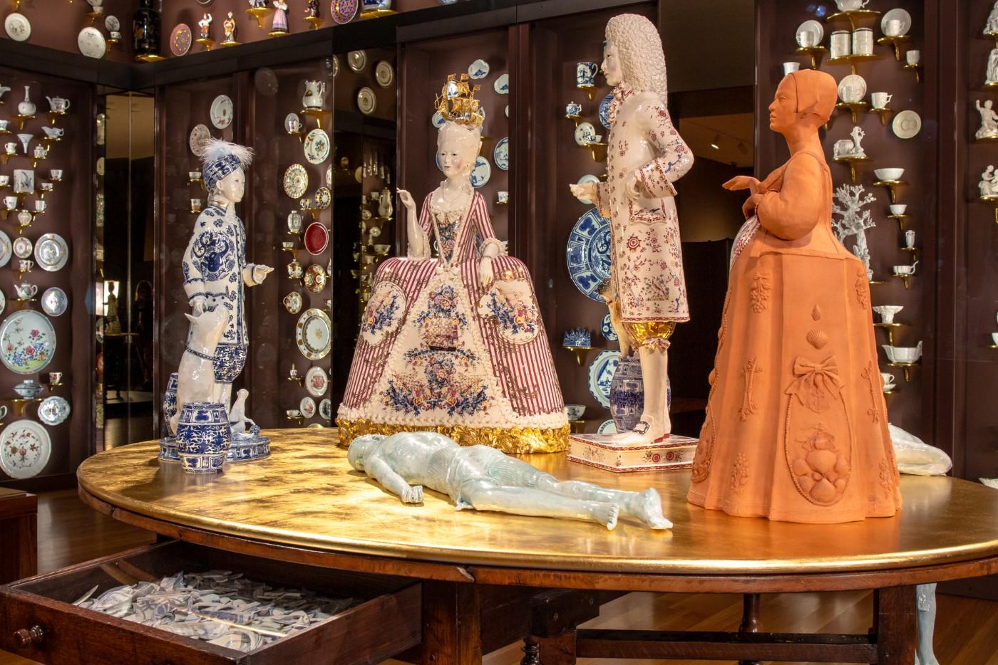 British ceramic artist Claire Partington’s site-specific installation Taking Tea is adding a new dimension to the Seattle Art Museum (SAM)’s popular Porcelain Room. Featuring over 1,000 European and Asian porcelain pieces from SAM's collection, the Porcelain Room is a treasure trove of priceless Eastern and Western pieces, with walls lined with glass cabinets showcasing the finest ceramics. Adding context to the stunning collection is the installation of Partington’s (b. 1973) tableau at the center of the gallery, consisting of six porcelain figures taking tea on a gold-topped antique table. Each figure tells a story, and each is made in a specific ceramic style to evoke different aspects of the history behind the European obsession for Eastern porcelain and tea. Through her use of material and symbolism, Partington explores the multi-faceted history of the international tea trade, including issues of appropriation, colonialism, slavery, and the gendered roles associated with tea.
