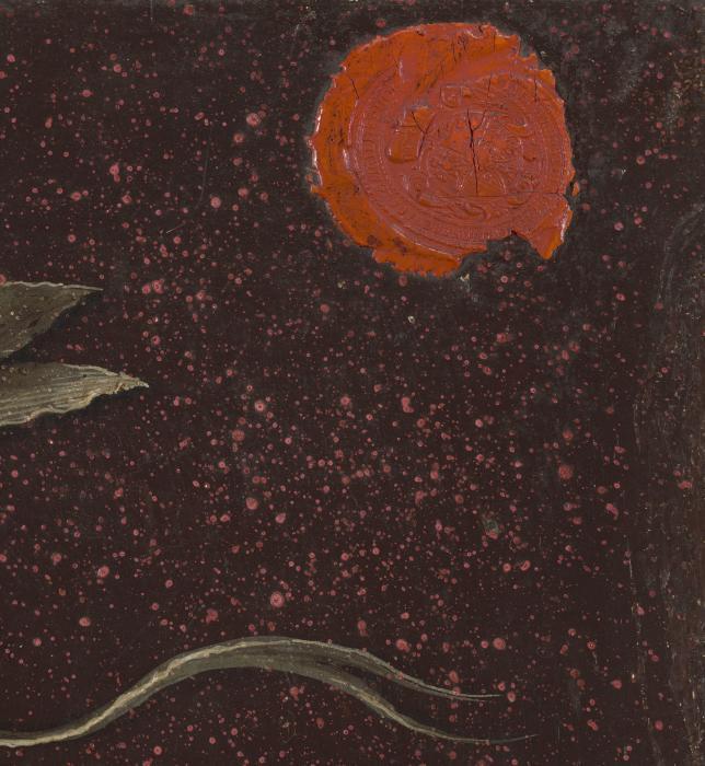 A detail of the Ginevra de’ Benci portrait reverse showcasing red wax with the Liechtenstein royal seal.