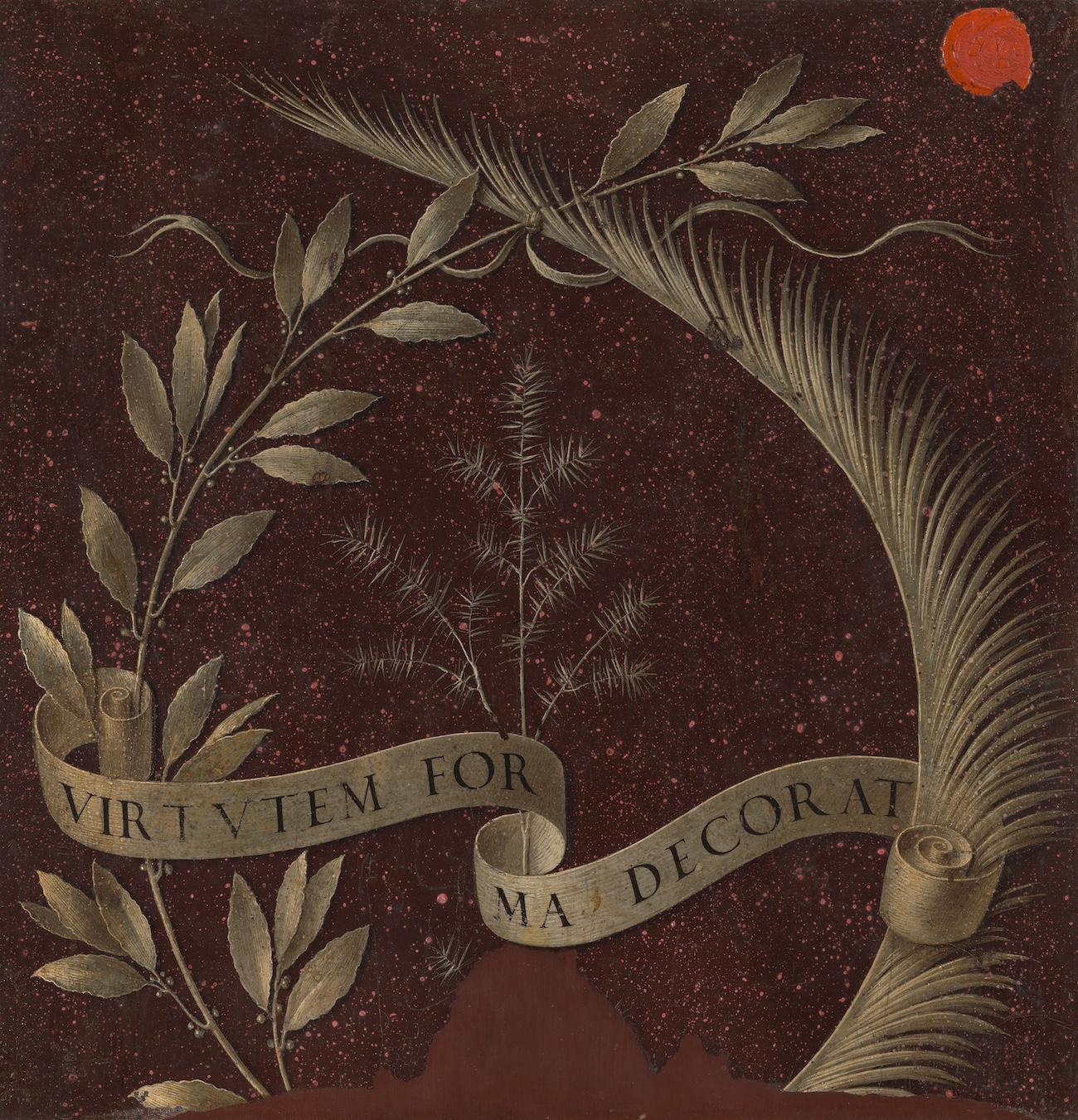 Wreath of Laurel, Palm, and Juniper with a Scroll Inscribed Virtutam Forma Decorat [reverse]. 1474/1478. Oil on Panel.