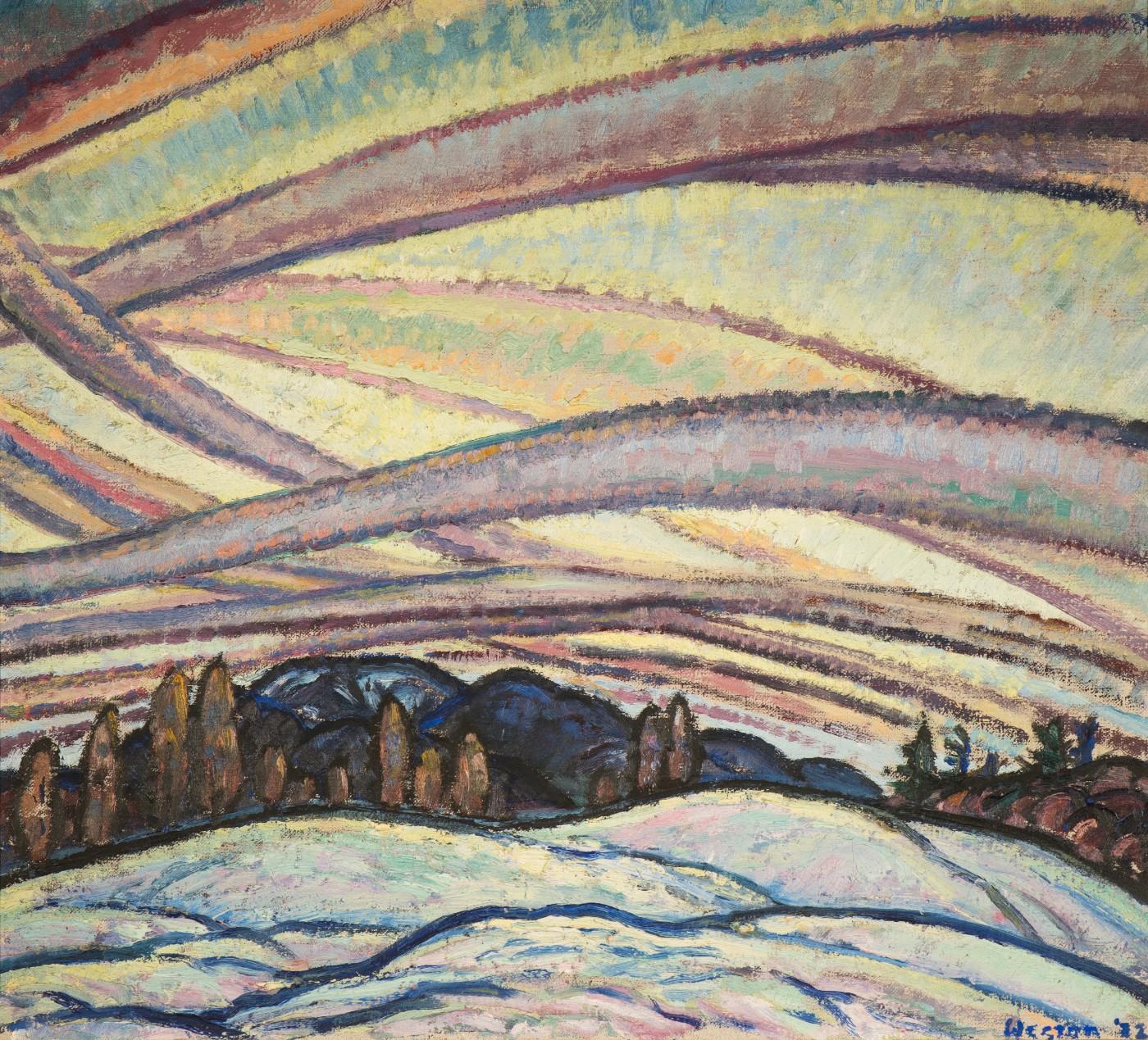 Born into a comfortably middle-class family on Valentines Day, 1894 in Merion, Pennsylvania, Weston’s pleasantly normal childhood changed dramatically when he was struck with polio in 1911. His doctors said he would never walk again. Defying all expectations he not only learned to walk but went on to hike up and down the mountains that became his primary subjects in paint years later. In 1912 he entered Harvard University, majored in fine arts and served as editor of the Harvard Lampoon while contributing artwork and cartoons. Although his bout with polio prevented him from serving in WWI, Weston volunteered with the YMCA, traveling throughout the Middle East working with soldiers in Baghdad to establish a therapeutic art club. The starvation and disease that he encountered in the region had a profound effect on him, inspiring a lifelong commitment to advocating for global food aid. Perhaps Weston sought solace from the horrors he witnessed when he returned to the mountains near Saint Huberts, New York and built a rugged one-room cabin. While living there he painted through the harsh winters from 1920-22, creating his most vital landscapes.