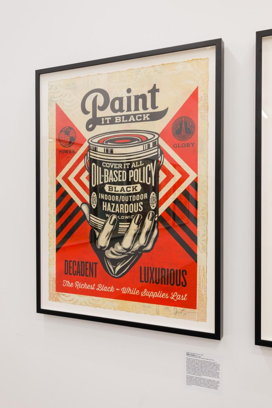 The conversations that Fairey’s works address include not only politics but also environmental justice (the aim of Vancouver’s Earth Justice), gender inequalities, xenophobia, economic imperialism, and war. The BAF exhibition features 30 hand-painted multiples, as well as paintings and stencils. One of the prints on view at the exhibition depicts a red rose that has grown through a shackle that features the slogan “Rise Above.” The sun-ray effect is an evident nod to Soviet and Chinese propaganda posters where political leaders were depicted surrounded by sun rays. The screenprint Paint it Black instead is a reference to the famous 1966 Rolling Stones hit and addresses the issue of the devastating effects that the oil industry has on the planet in terms of carbon emissions and pollution. About Fairey and the impact of his art, the founder and board president of the BAF, Christian Chan, said: “Shepard has the unique ability to capture the public imagination, generate positive dialogue and spur people to action through bold and beautiful artwork.”