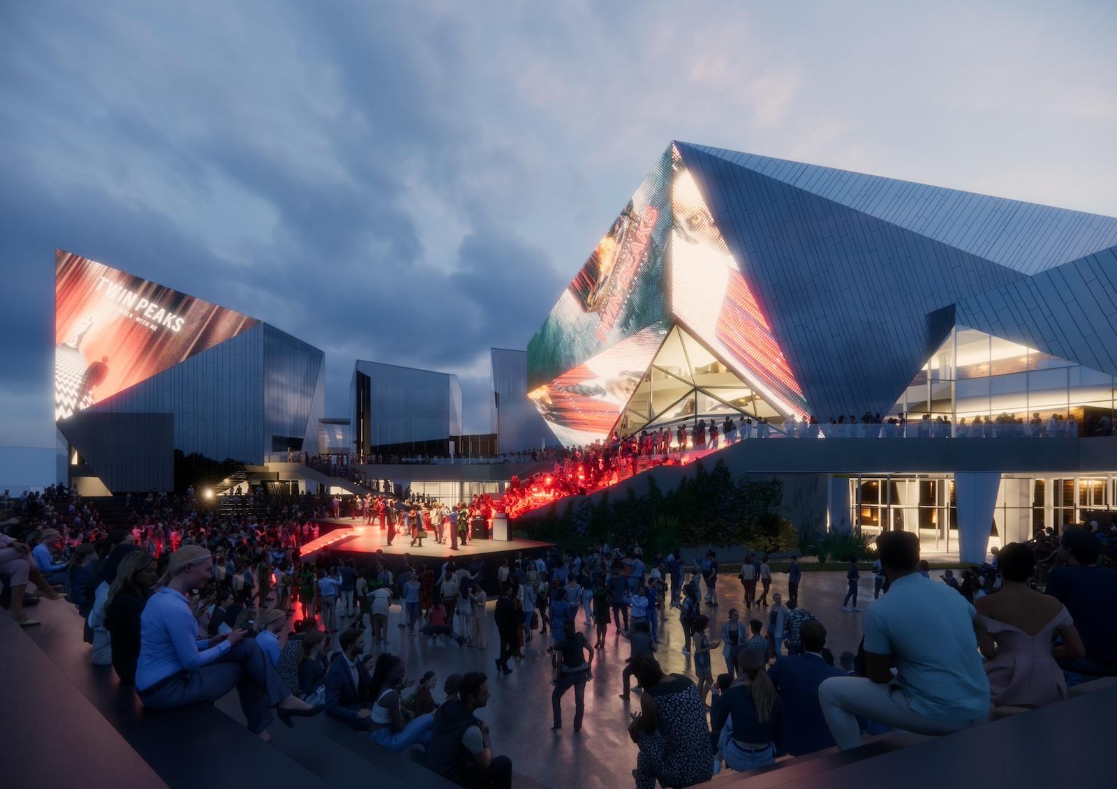 People attending an event held in the square in front of the European Film Centre CAMERIMAGE building, 2022. License