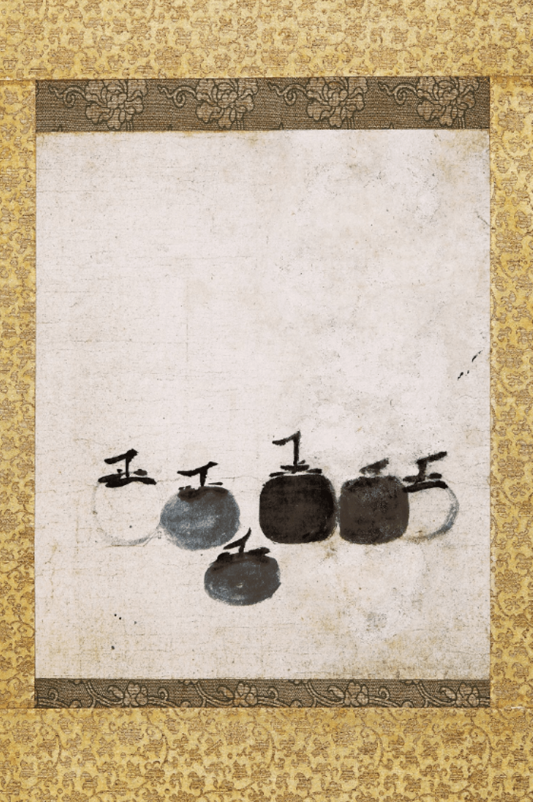 What is so special about Six Persimmons and Chestnuts? And most importantly, why are they seen as two of the finest examples of Zen art? At first glance, the two paintings are quite bare and simple. Six Persimmons portrays the six fruits in different shapes and shades of ink, with the stems pointing in various directions, and with an asymmetrical distance between them. Similarly, Chestnuts shows a branch of a chestnut tree with leaves and four chestnuts. Both paintings feature a darker, central figure flanked on both sides by other elements in lighter shades, different sizes and orientation. The darker figure draws the viewer’s gaze to the center and allows the multiple elements to be perceived as one. This stylistic choice was common among the Chinese painters who worked in the last decades of the Song Dynasty (960-1279). Yet, Muqi was different from his contemporary colleagues and it might be for this reason that his works were more appreciated in Japan than in China.