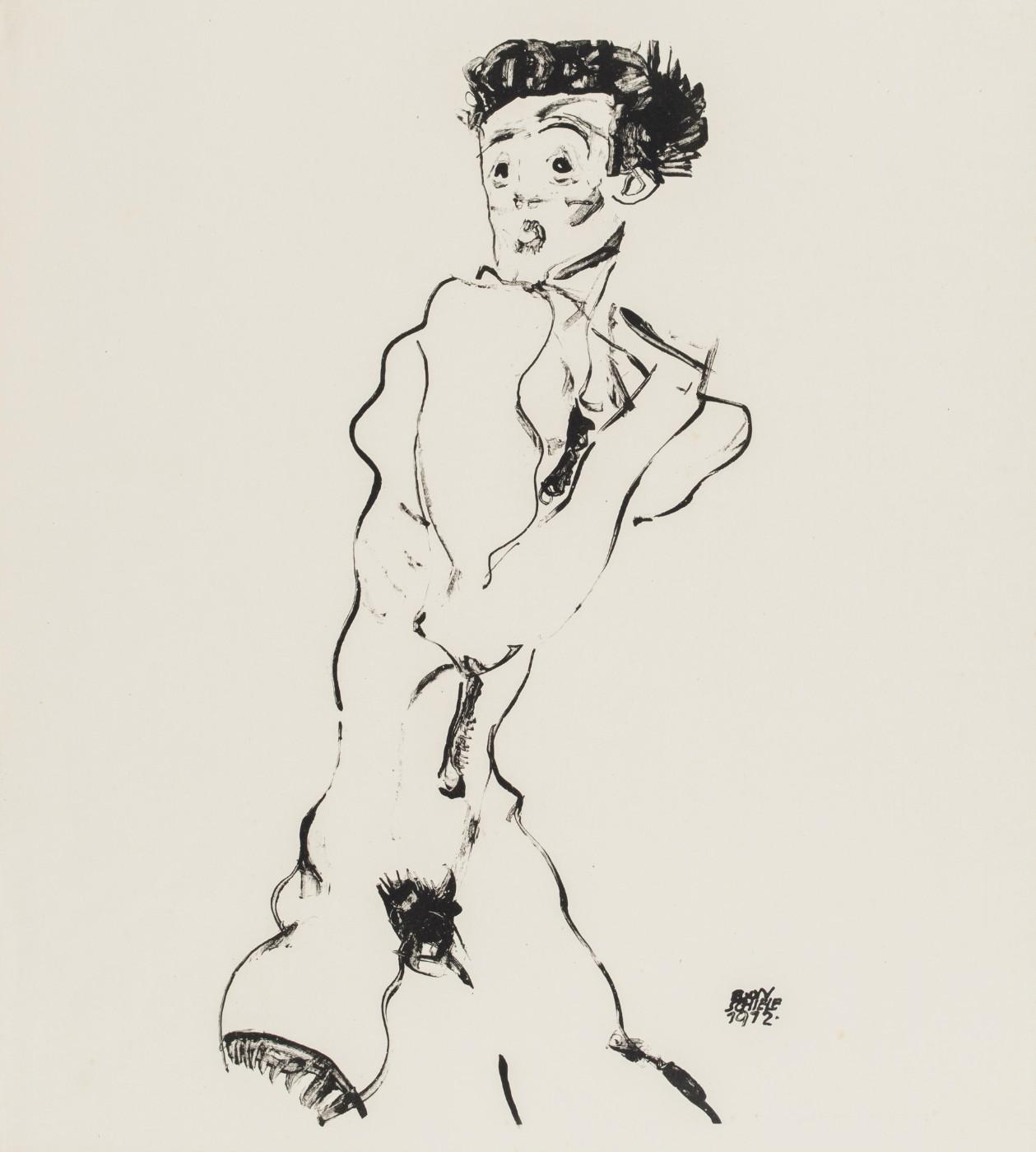 Egon Schiele (Austrian, 1890-1918), Male Nude (Self-Portrait) II, 1912. Lithograph on heavy white paper. Unsigned proof. One of three known impressions. 16 1/2" x 8" (42 x 20.3 cm). Kallir G. 2. Private collection.