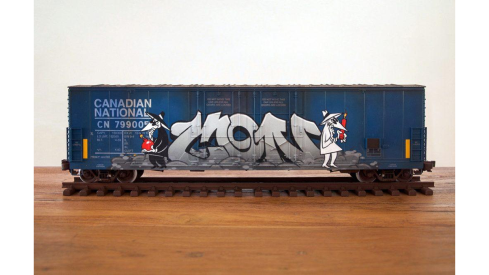 Graffiti writer Tim Conlon brings his tags and spraypaints into the gallery through massive paintings and miniature train cars that recreate the world of street art in photorealistic detail.