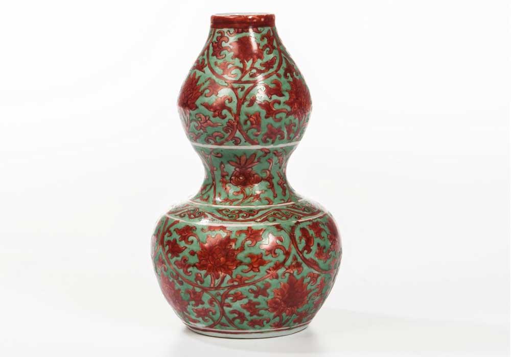 This Red- and Green-enameled Double Gourd Vase is decorated with scrolling lotus design, a band of lingzhi scroll around the waist, and features a six-character Jiajing mark on base.