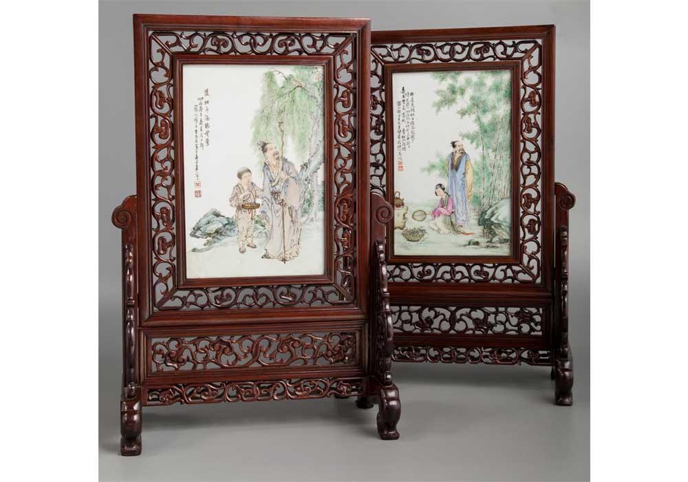 A Pair of Wang Dafan Porcelain and Hardwood Table Screens, Republic Period, circa 1912-1949