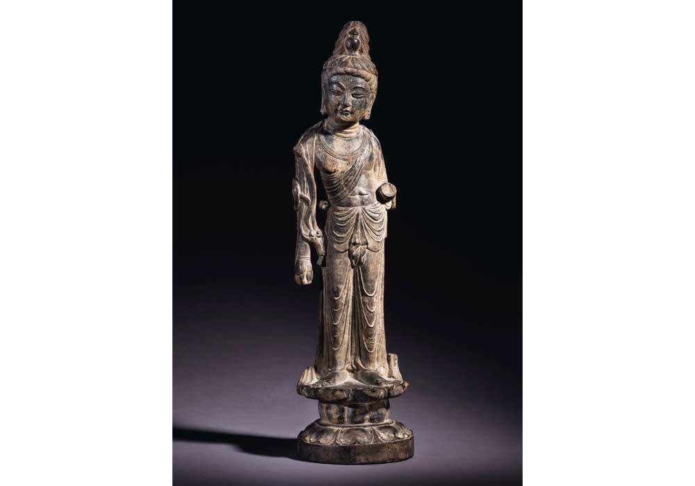 An Important and Very Rare Grey Limestone Figure of Mahasthamaprapta, early Tang Dynasty, 8th Century