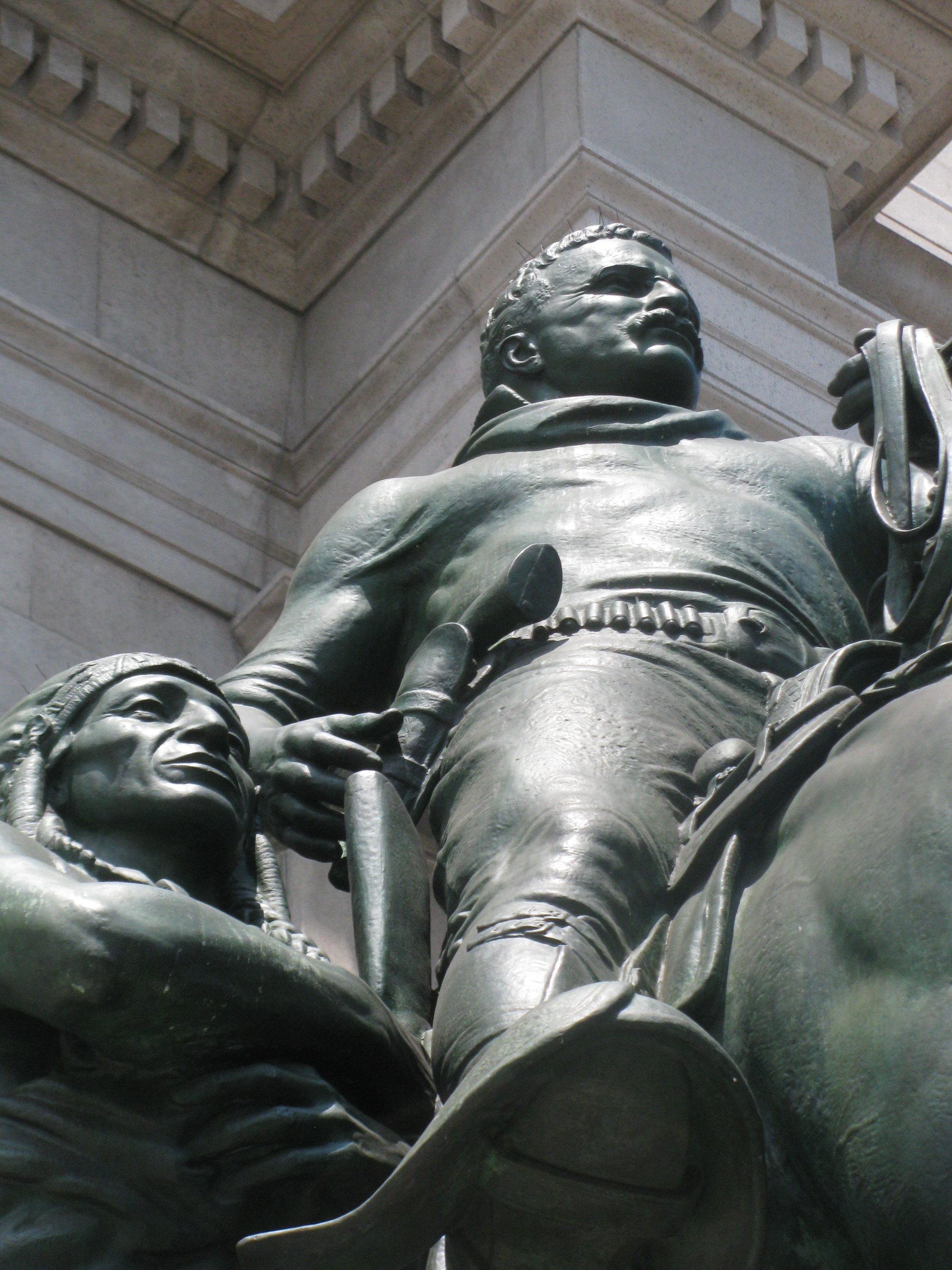 The Equestrian Statue that sits on New York City public park land in front of the Museum’s Central Park West entrance is part of the New York State memorial to Theodore Roosevelt, who served as Governor of New York State before becoming the 26th President of the United States. The Statue has long been controversial because of the hierarchical composition that places one figure on horseback and the others walking alongside, and many of us find its depictions of the Native American and African figures and their placement in the monument racist.