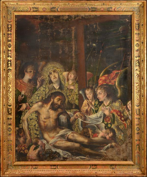 Exhibition Highlights. The exhibition includes a range of materials-costumes, paintings, sculptures, and decorative arts. Among the exhibition's highlights are several new acquisitions, including the monumental Pieta by the Potosf painter Melchor Perez Holgufn, which was restored for the exhibition. A video of the painting's restoration will be accessible via the exhibition and on LACMA's website. Other highlights are a series of works employing shells known as enconchados; these include paintings created in the viceroyalty of New Spain (Mexico), and decorative arts produced in Guatemala for export to Mexico and Lima. The designs referenced a broad repertoire of Indigenous, European, and Asian sources, which were creatively synthesized and recombined by local artists.
