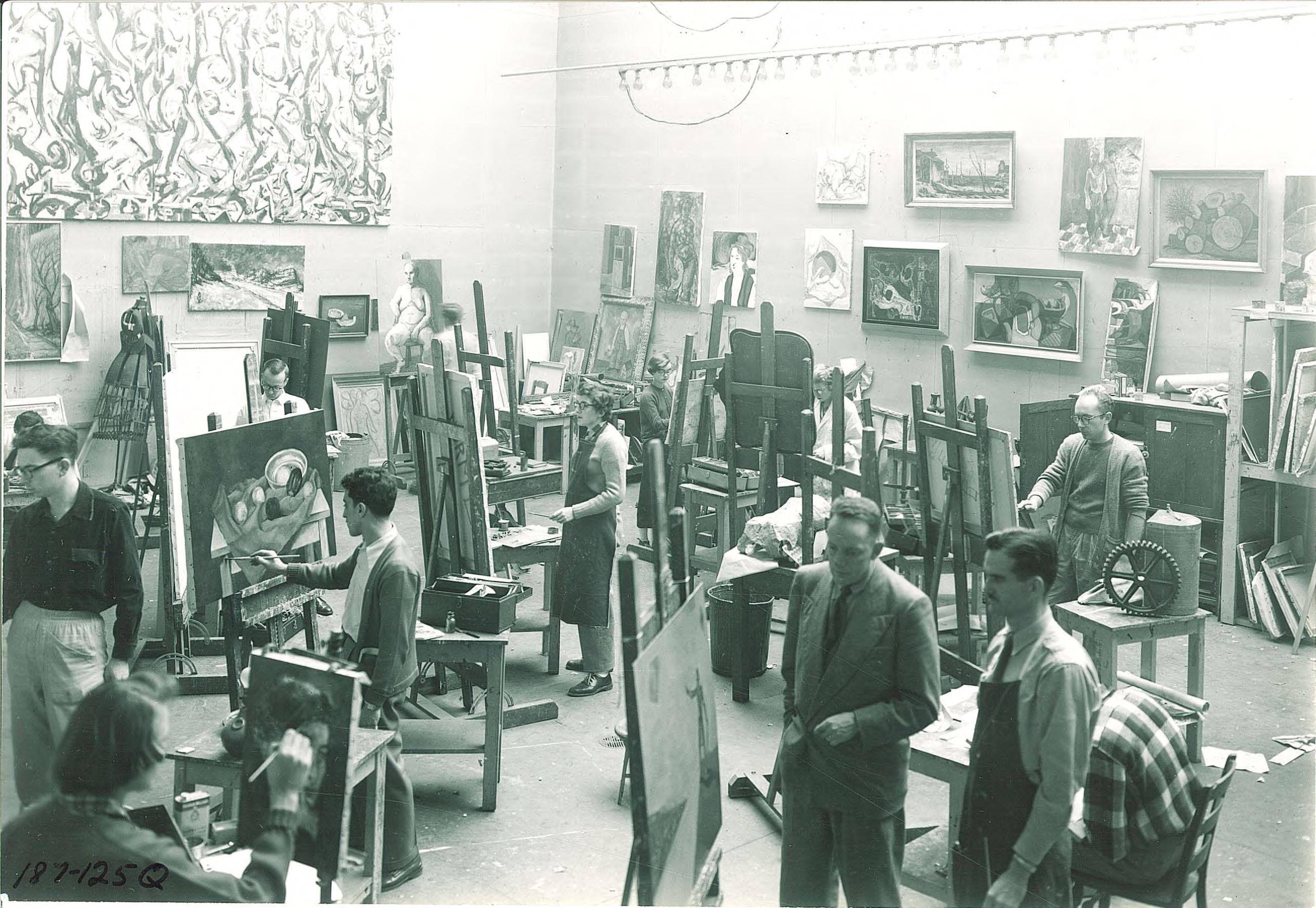 Art students painting in studio with Jackson Pollock's Mural, The University of Iowa, January 10, 1952.