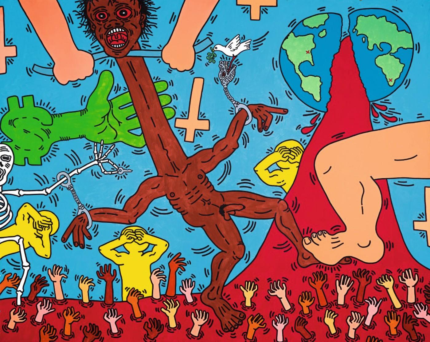 Keith Haring, Michael Stewart – USA for Africa, 1985. Enamel and acrylic on canvas, 294.6 x 365.8 cm. Collection of Monique and Ziad Ghandour.