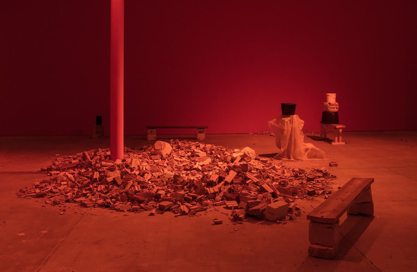 The devastation is in evidence at the KW Institute, where Dineo Seshee Bopape’s installation takes over the main hall. Visitors can pick their way through broken bricks, torn-off metal pipes with protruding tangled cables, and buckets catching drips of water. Makeshift benches allow you to survey the damage, all lit in apocalyptic orange. Screens among the rubble show videos–one displays Nina Simone singing “Feelings,” while another plays scenes from a park on the outskirts of Paris. Bopape invited three other artists to contribute to her work, and at first glance, it looks as if Jabu Arnell’s giant ball suspended from the ceiling might be responsible for the wreckage. But “Discoball X” is made of cardboard hastily stuck together with tape–hardly materials capable of destroying bricks and mortar.