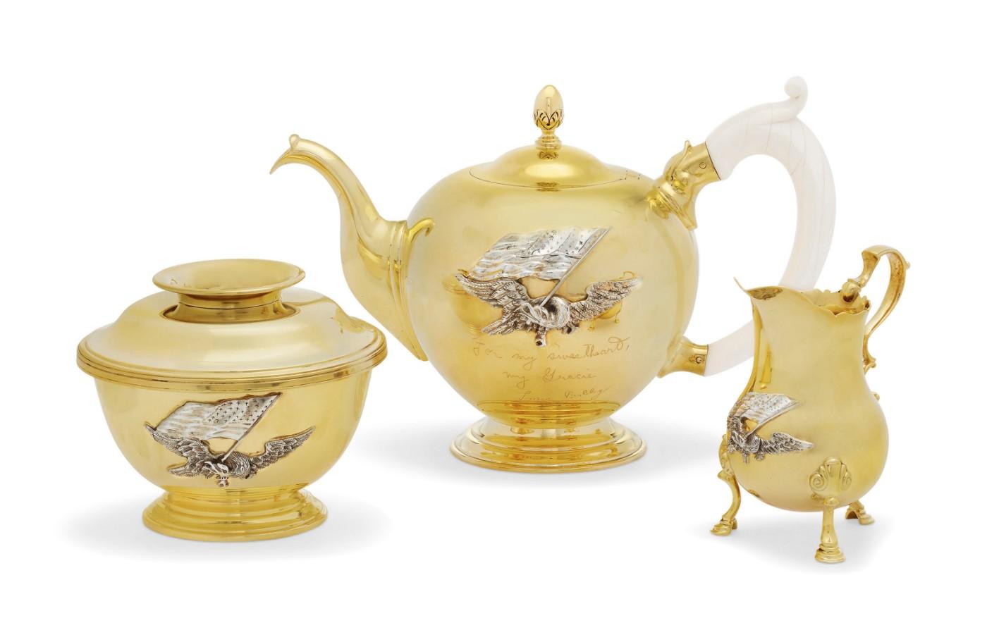 An American Silver-Mounted 18-Karat Gold Three-Piece Tea Set, Mark of Ubaldo Vitali, Maplewood, New Jersey, Late 20th Century