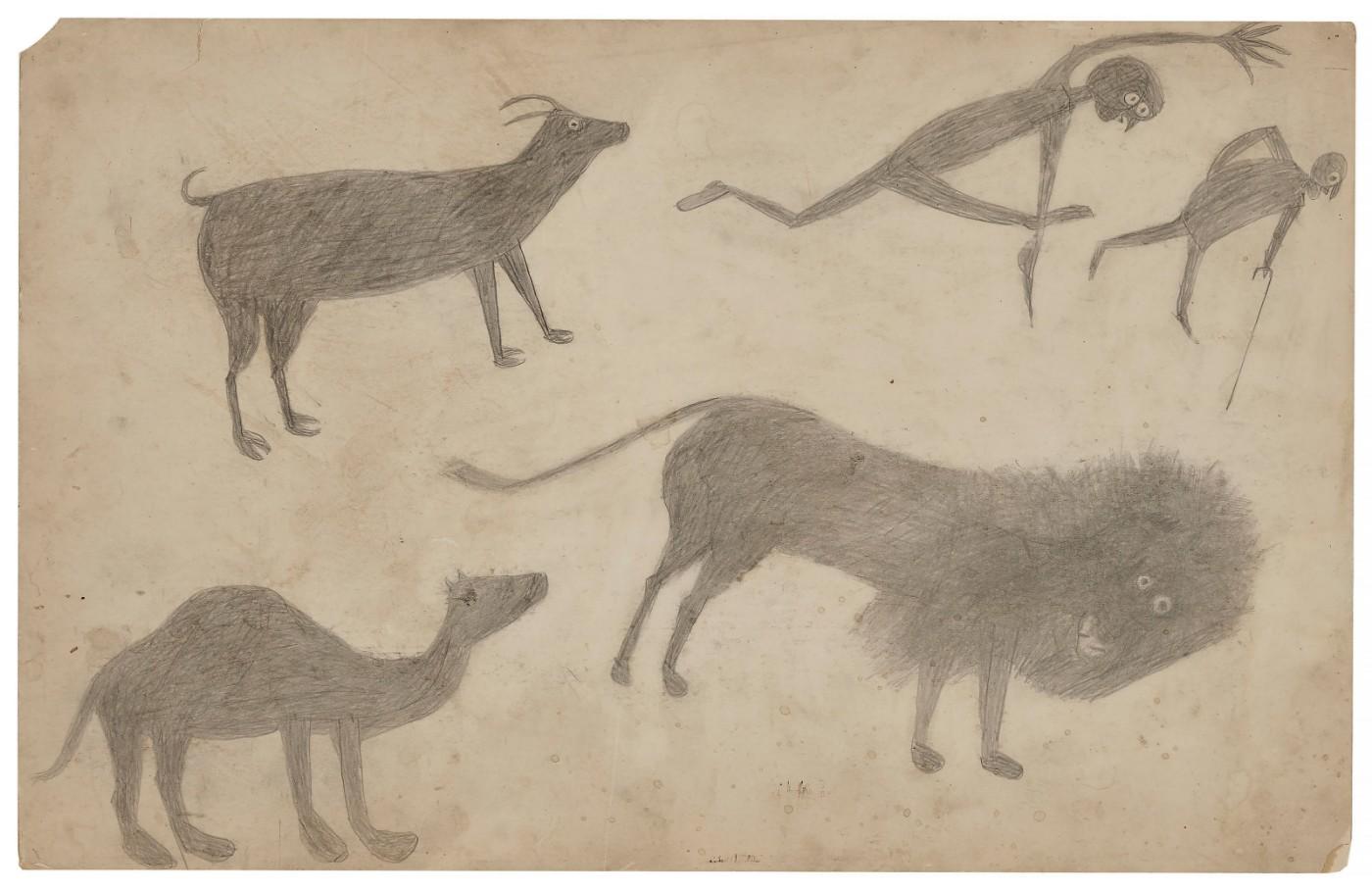Bill Traylor (circa 1853-1949), Goat, Camel, Lion and Figures, circa 1939, graphite on repurposed card