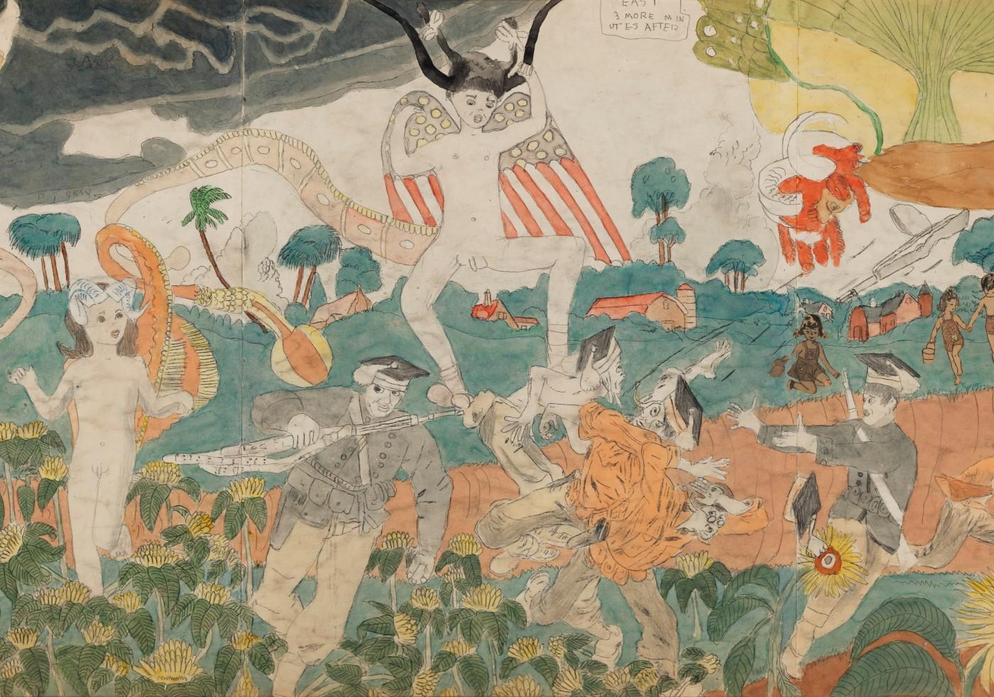 Henry Darger (1892-1973), 148 At Jennie Richee During fury of storm are unsuccessfully attached [sic] by Glandelinians / 149 At Jennie Richee narrowly escape capture but Blengins come to rescue (double sided)