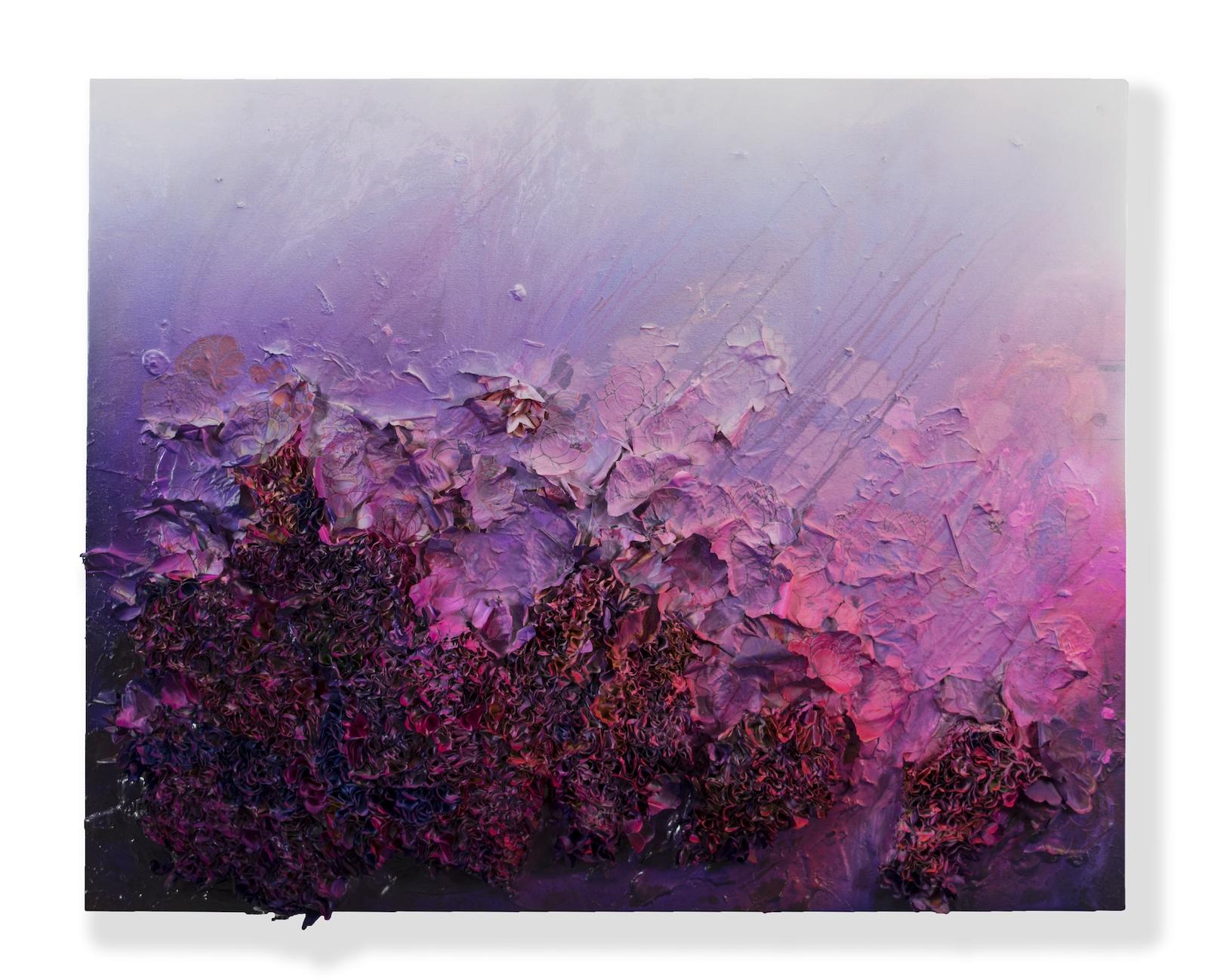 Hong Yi's new artworks came about through his desire to escape the restrictions of lockdown and to remain awake to the beauty of nature through creativity. This desire led him to embrace his craft all the more as a means of overcoming the anxiety-inducing effects of isolation, while also spreading his message of hope and positivity. Rebirth encapsulates this message. Its pink color symbolizes prosperity and its abundance across the full horizon of the canvas represents the blossoming hope for sunnier, more favorable times to come.