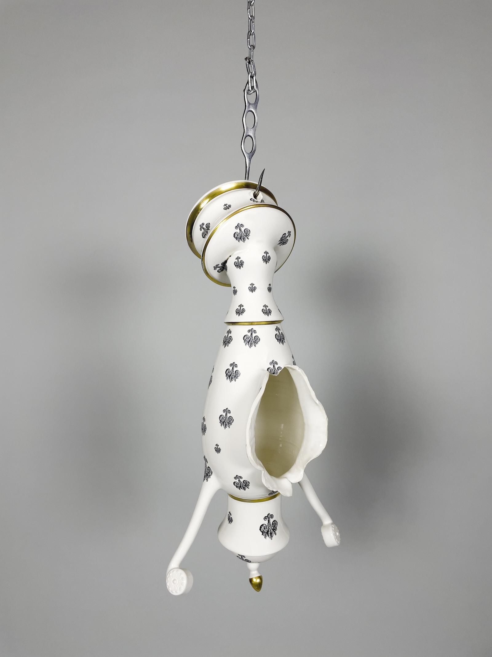 Laurent Craste, Carcasse IX (Carcass IX), 2024/25, Porcelain, glaze, custom decals, burnished mat gold, butcher hook, and chain, 25 × 11 4/5 × 7 1/2 inches