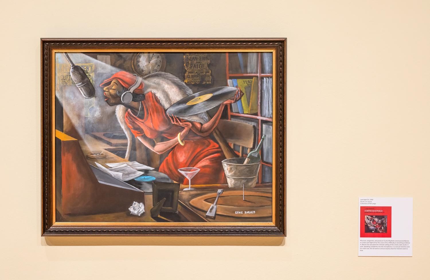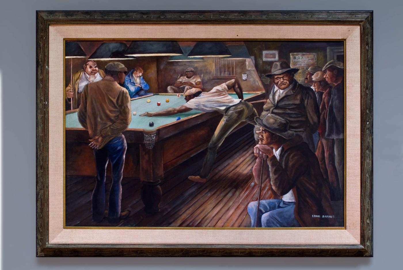 Growing up in the Jim Crow south, Ernest Barnes Jr had limited options to pursue his artistic endeavors. His first opportunity came when accompanying his mother to work in the home of a wealthy local attorney, who encouraged the young Barnes to peruse his collection of art books. An all-star football player at his segregated high school, Barnes was offered 26 college scholarships, choosing to attend the nearby North Carolina College at Durham (now North Carolina Central University), majoring in art. In 1959 Barnes was drafted by the Baltimore Colts and went on to play for several NFL teams. An injury lead to his early retirement in 1965.