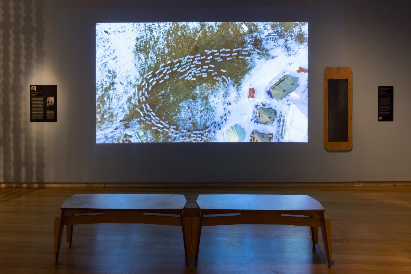 Also on view is the installation Every One (2018), which likewise began as an instructional video, this time for Luger's Missing and Murdered Indigenous Women, Queer and Trans People (MMIWQT) Bead Project. The video invited communities across the United States and Canada to create and donate two-inch clay beads, which Luger fired, stained, and strung together to make a monumental curtain. Each handmade bead in Every One is a memorial to one of the four thousand cases of missing and murdered indigenous women, girls, queer and trans people in Canada, thereby humanizing the statistics of the lost members of the indigenous community and bringing awareness to a long history of violence.
