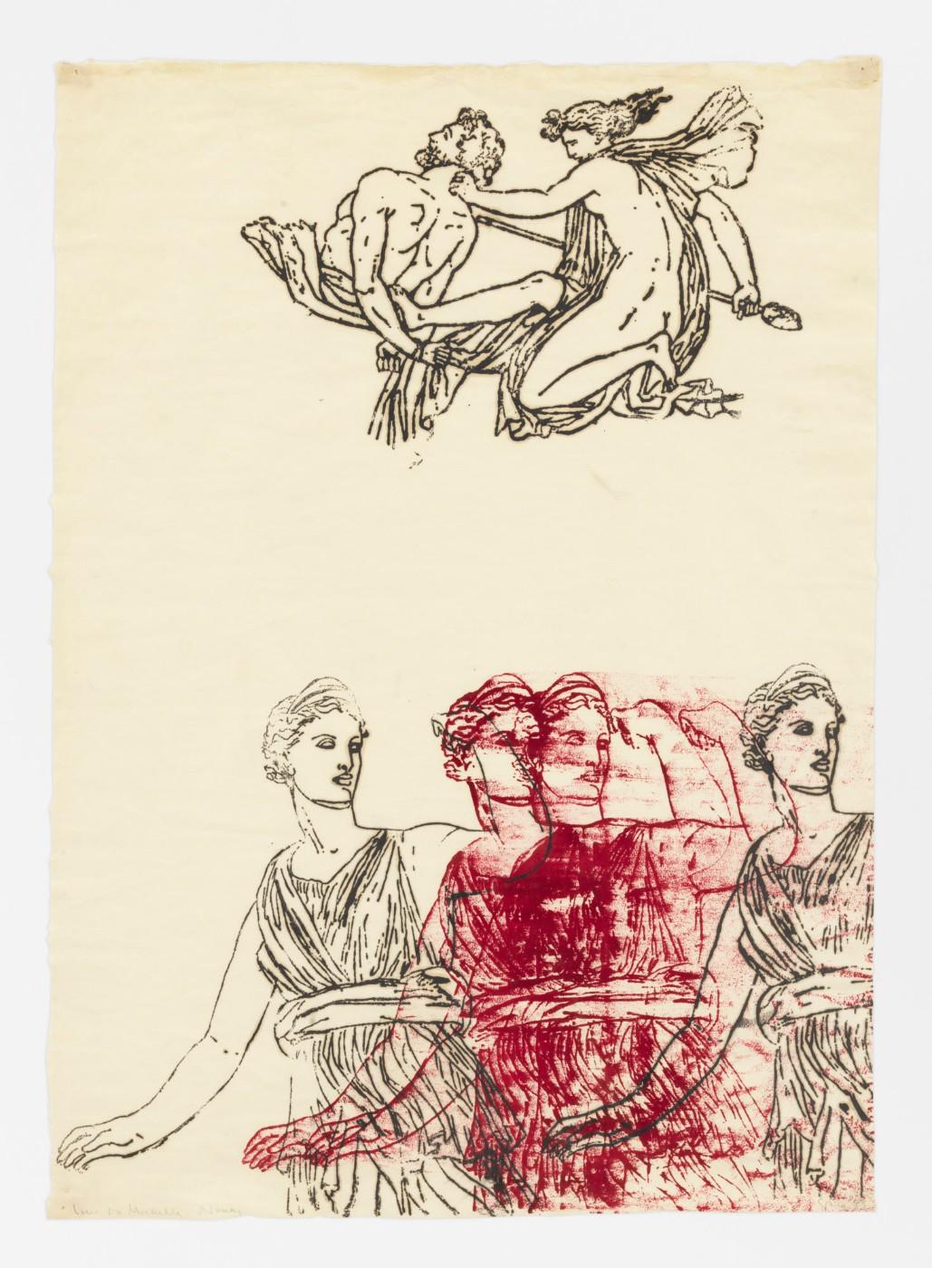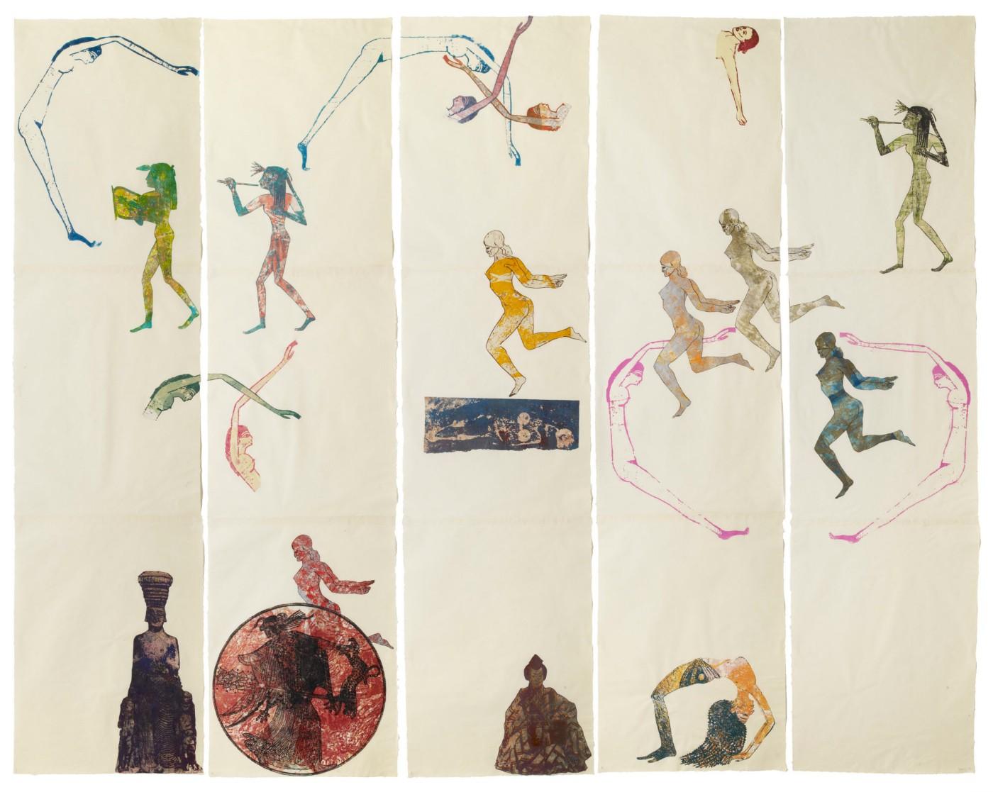 Nancy Spero: Paper Mirror surveys the full scope of Spero’s career, beginning with her early figurative paintings. Provoked by the atrocities of the Vietnam War, Spero began to incorporate activism into her work in the 1960s, a period during which she concluded that painting had become “too conventional, too establishment.” Abandoning canvas for paper, Spero’s The War Series (1966-1969) conveyed her outrage in depictions of sexualized bombs that personified the gendered brutality of the conflict. From 1966 onward Spero worked primarily on paper, and women’s history gradually but emphatically became her central subject. In scroll-like compositions from the 1970s, Spero placed fragments of text alongside female figures derived from a vast range of historical sources, probing the gendered relationship between language and power. Collaging together images from mythology, folklore, art history, literature, and media―and presenting them in a range of formats from scrolls to friezes to room-sized installations―Spero described her works as “ephemeral monuments” to the full range of women’s experience.