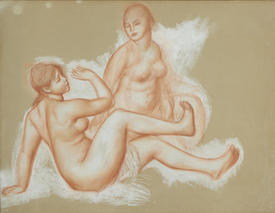 In this study for his painting of modern naiads, the artist explored the pose of the bather in the left foreground of the painting, recoiling as one of her companions splashes her. While the figure appears almost identical in the painted version, Renoir replaced her passive companion by the river bank with a more animated bather, wrapping herself in a sheet.