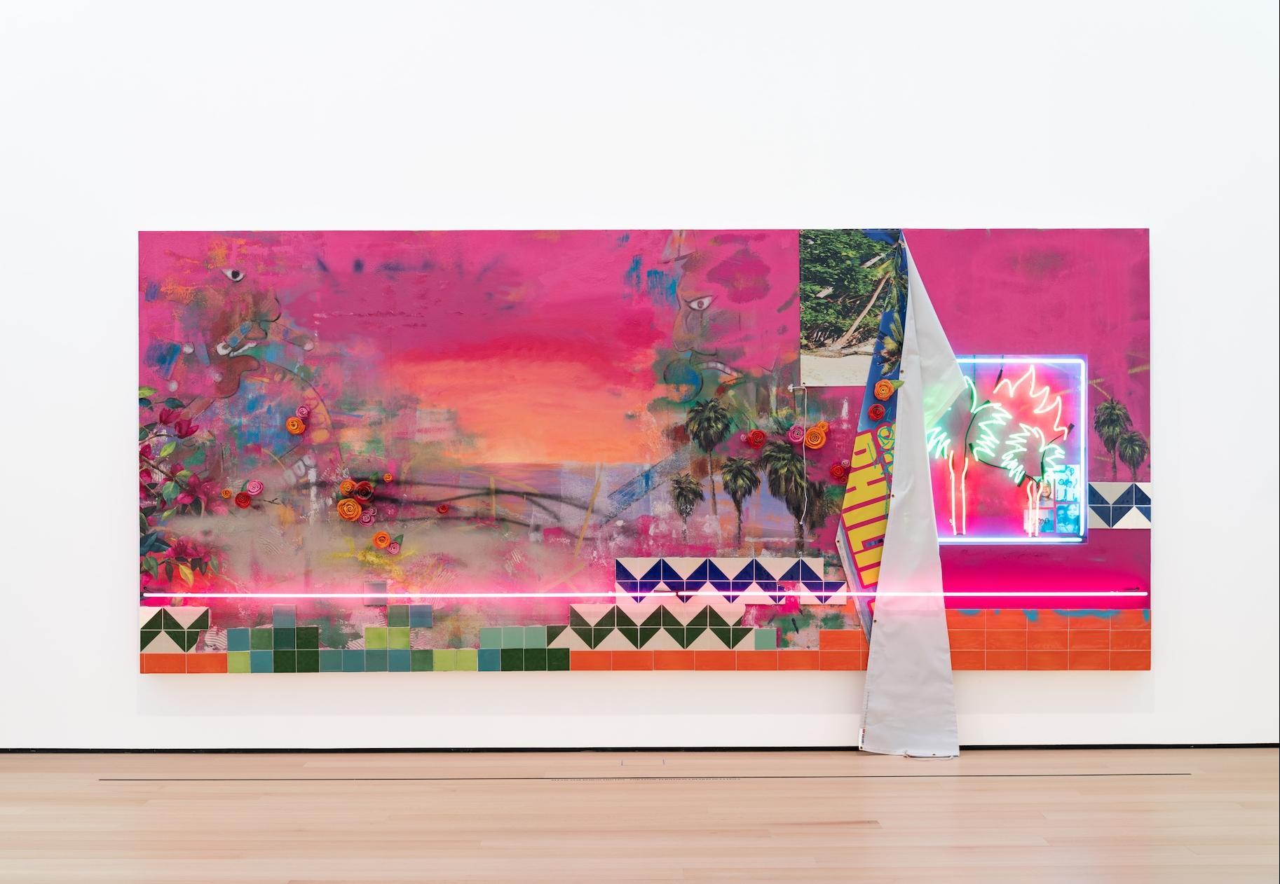 Let Us Gather in a Flourishing Way installation view. Patrick Martinez, Promised Land, 2022. Acrylic, stucco, neon, Mean Streak, ceramic, spray paint, latex house paint, banner tarp, ceramic tile, tile adhesive, and family archive photo collage on panel. 84 × 192 × 7 in. (213.4 × 487.7 × 17.8 cm). Collection Buffalo AKG Art Museum, George B. and Jenny R. Mathews Fund, 2022.