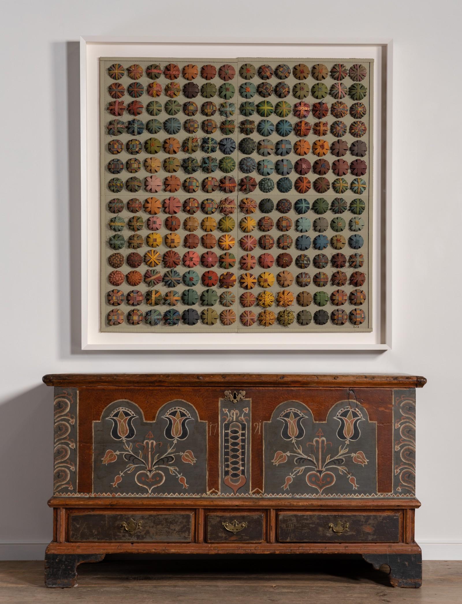Laurene Krasny Brown, A Democracy of Domes, 2020. Gouache, thread on paper. 40 x 40 x 1.5 in. Pictured above an 18th century Pennsylvania dower chest in original paint.