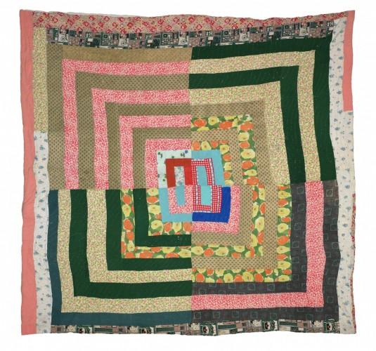Another highlight is Housetop by Delia Bennett (1892-1976), who was the matriarch of an extended family of quiltmakers that included daughters and granddaughters. This quilt, made about 1955, is a “fractured” variation of the traditional single-block design. It uses four separate L shaped Half-Log Cabin blocks stitched together to make a larger Housetop pattern.