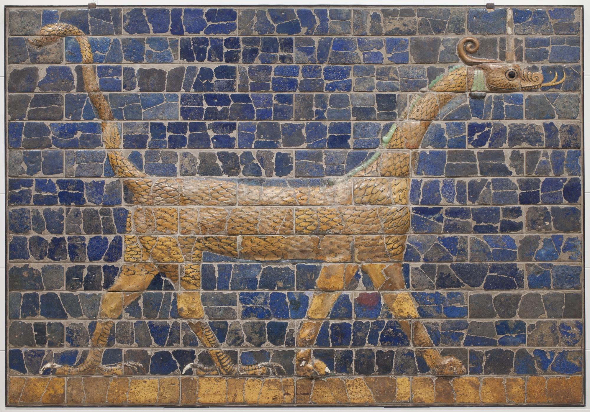 Mushhushshu-dragon, Symbol of the God Marduk Snake-Dragon, Panel from the Ishtar Gate, 604-562 BCE. Glazed terracotta and molded brick.