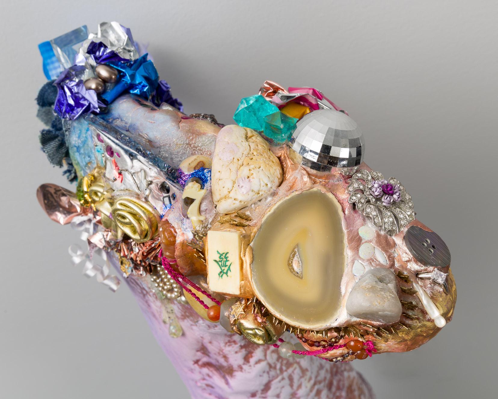 Suspended in my Masquerade, referencing a lyric from Springsteen’s Growin’ Up, investigates the complex rituals surrounding memory and sentimental objects. Driven by a strong emotional connection to her family, friends and community, Klinghoffer pays homage to the past by literally suspending those personal items in time and space, imploring viewers to excavate. Simultaneously organic and alien-like, her sculptural forms are covered, surface textures obliterated and then exquisitely adorned with small embedded objects of personal significance. Surface colors reference the Romantics, particularly the Hudson River School with its emphasis on the subtleties and range of light. Her laboriously manipulated sculptural shapes hint at everyday objects including pre-loved sneakers, repurposed precious and semiprecious stones including rubies, sapphires, emeralds, even diamonds. Closer inspection allows for explanation of the greater meanings designated to each item. Materials lists read like memories, items like “one of the vintage boots I wore all through undergrad”, and “coral necklace from uncle”.